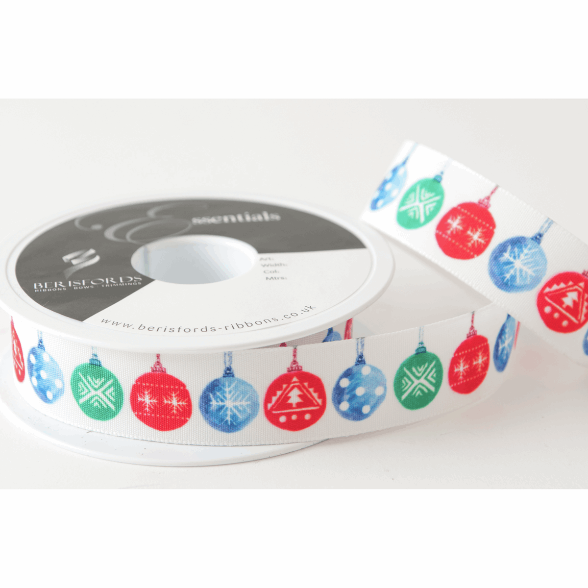 Cheery Christmas baubles decorate this festive ribbon with traditional motif patterns creating a playful trim for childrens gifts. Washable on a gentle cycle at 40 degrees centigrade or dry clean. Cool iron. Do not bleach or tumble dry.