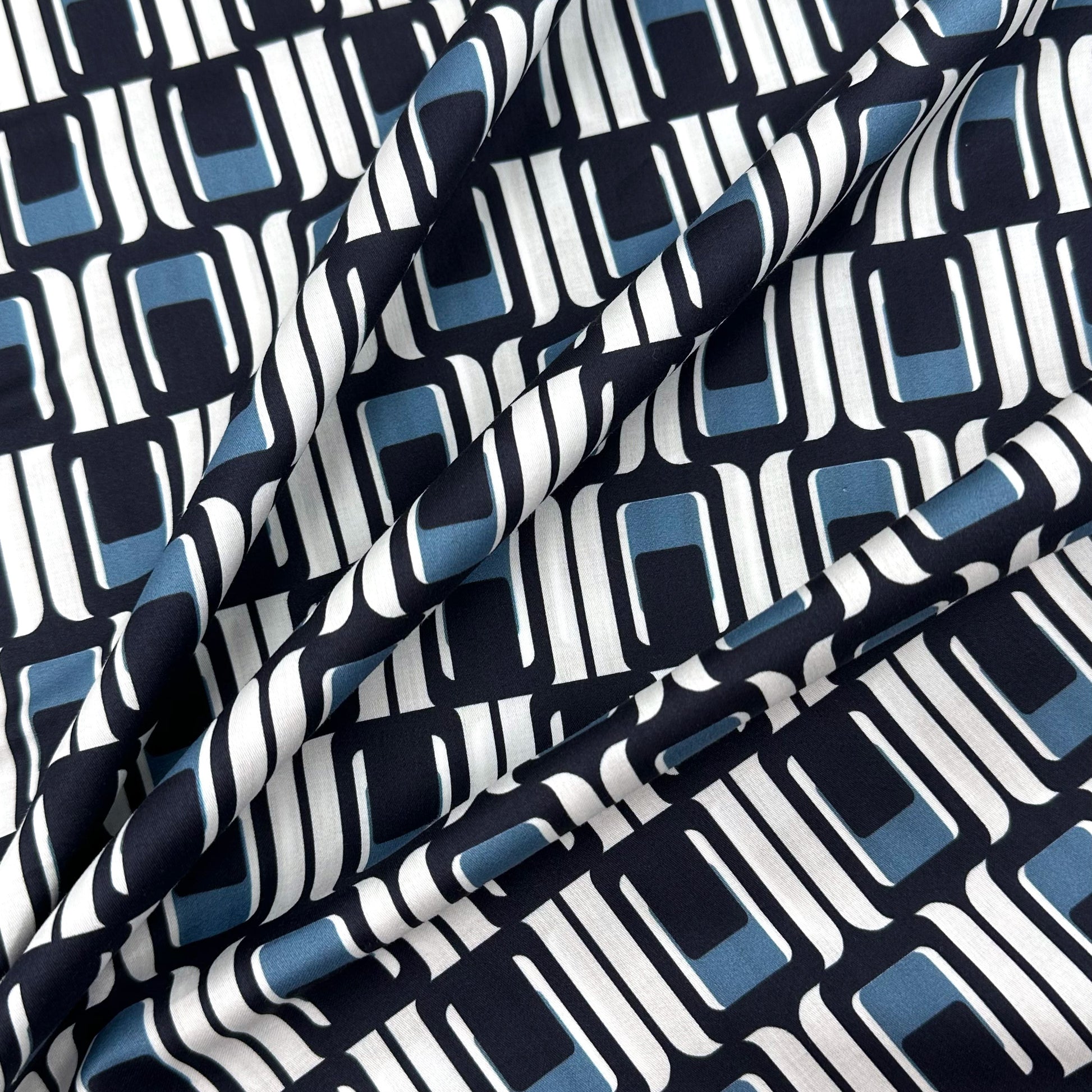 A crisp and smart cotton poplin fabric, featuring a retro style geometric design.