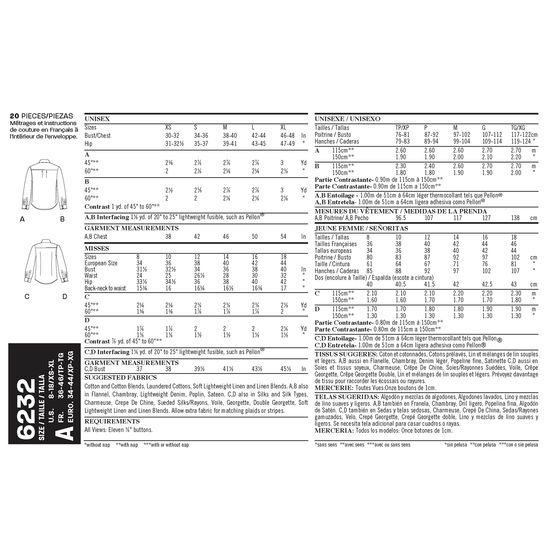 Misses' and Men's long sleeve button down collared shirt with optional pockets. For added interest, shirt can be made with contrasting collar, cuffs, inside yoke, and placket. New Look sewing pattern.