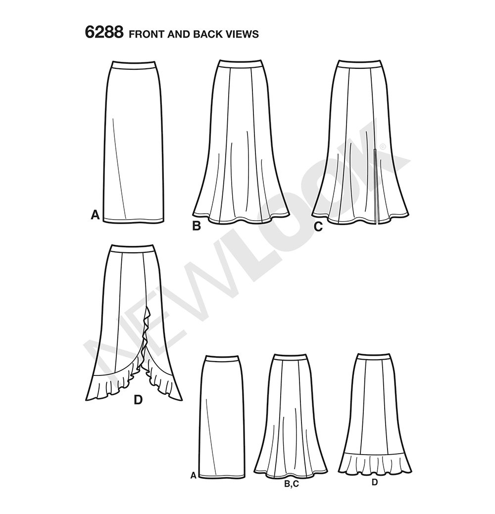 Misses' pull on maxi skirts are comfortable and perfect for any occasion. Easy skirts can be slim, full, full with slit and draped with ruffle hem. New Look sewing pattern.