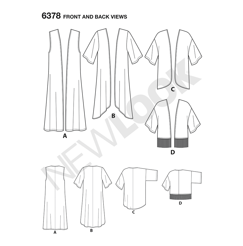 This Easy kimono pattern includes long high low kimono and short kimono with half sleeves, cropped kimono with fringe hem, and floor length kimono vest. New Look sewing pattern.