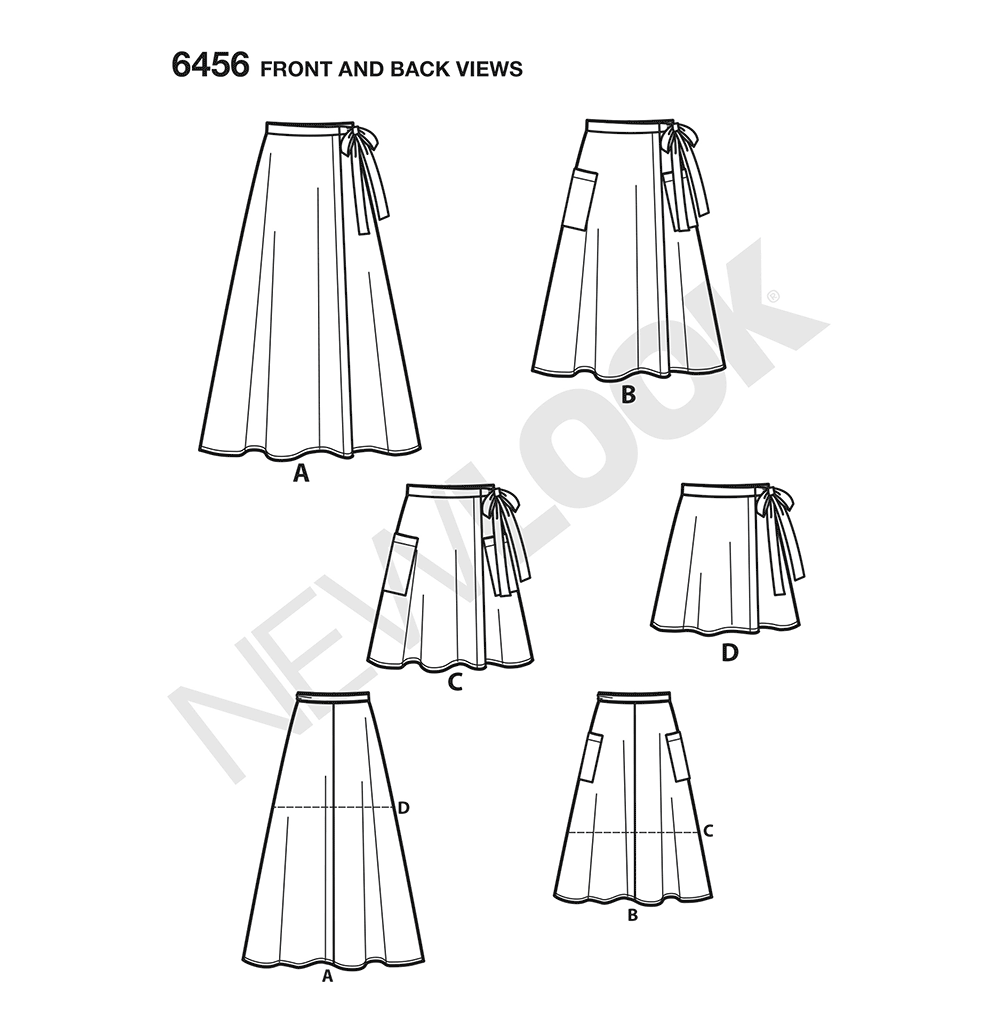 Make these great wrap skirts in the perfect length for you. Skirt can be maxi, midi, knee length, or mini. Midi and knee length skirts feature side patch pockets, knee length in contrast fabrics. New Look sewing pattern.