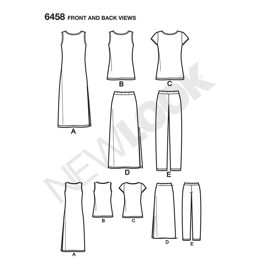 New Look Just 4 Knits wardrobe pattern includes knit tank, tee shirt, pull on pants, maxi skirt and maxi dress with side slits. Easy to sew & great for travel.