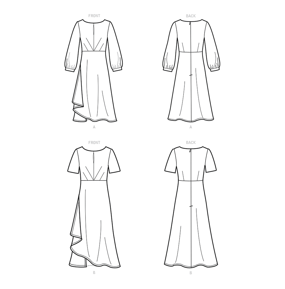 Misses' Dresses in two lengths. Empire-waist seaming, with front tucks adding fullness at the bust. Skirts in two lengths have front drape detail. Short one long sleeves. Designed for wovens with good drape.