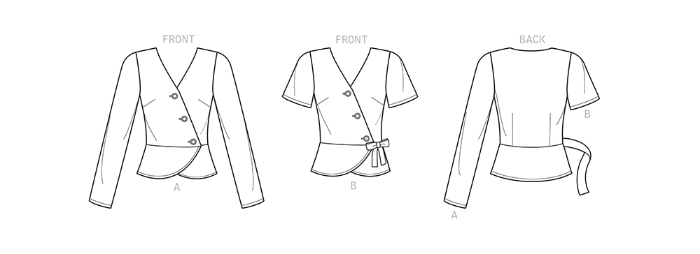 Misses' wrap tops with button closure, long sleeve or loose-fitting short sleeves and optional tie closure.