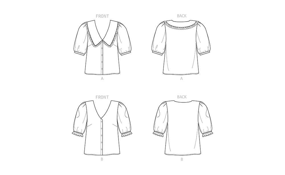V-neck button front blouses are with or without ruffled collar. Sleeves have pleats at shoulder seam. Hem is finished with either band or elastic gathers with ruffles.