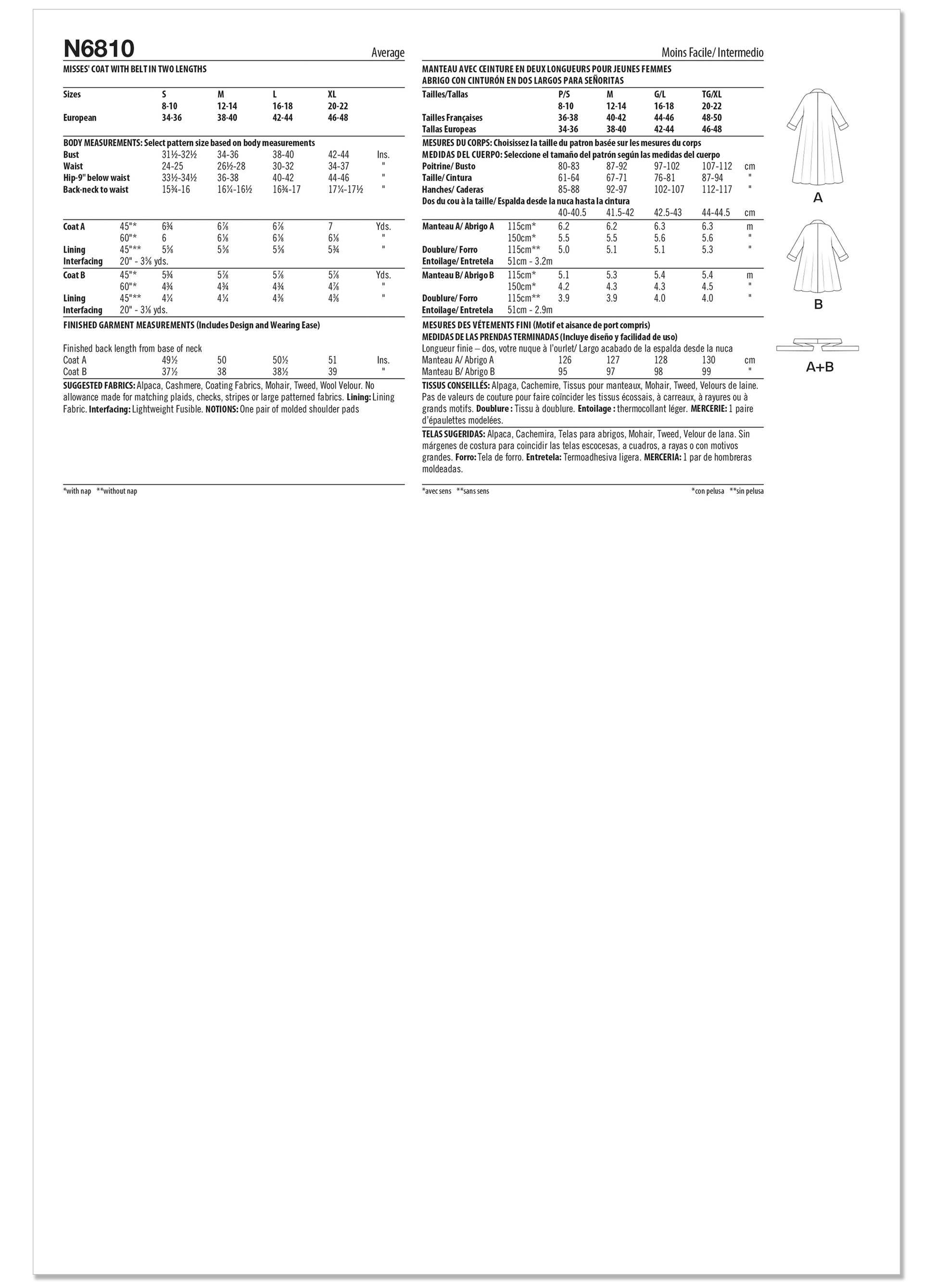 Oversized lined swing coat in ankle or knee length has long batwing sleeves with turned up cuffs, shoulder pads, patch pockets with flaps and dramatic notched collar. Coats can be worn with or without self-fabric tie belt.