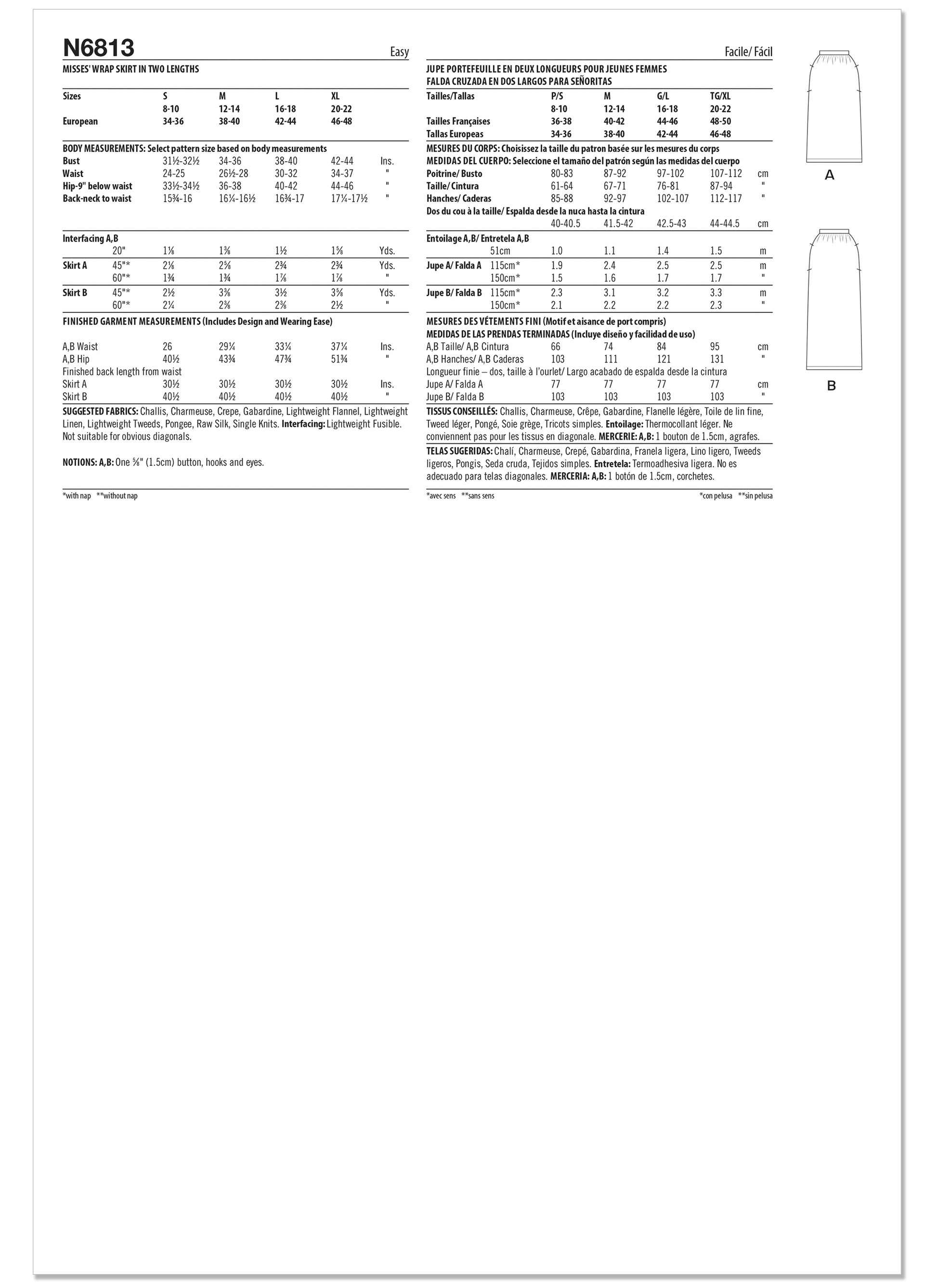 Straight wrap skirt has slim fit with front and back gently gathered into waistband and side front button closure. Both mid-calf and ankle length options have tulip hemline with top stitched narrow hem and side seam pockets.