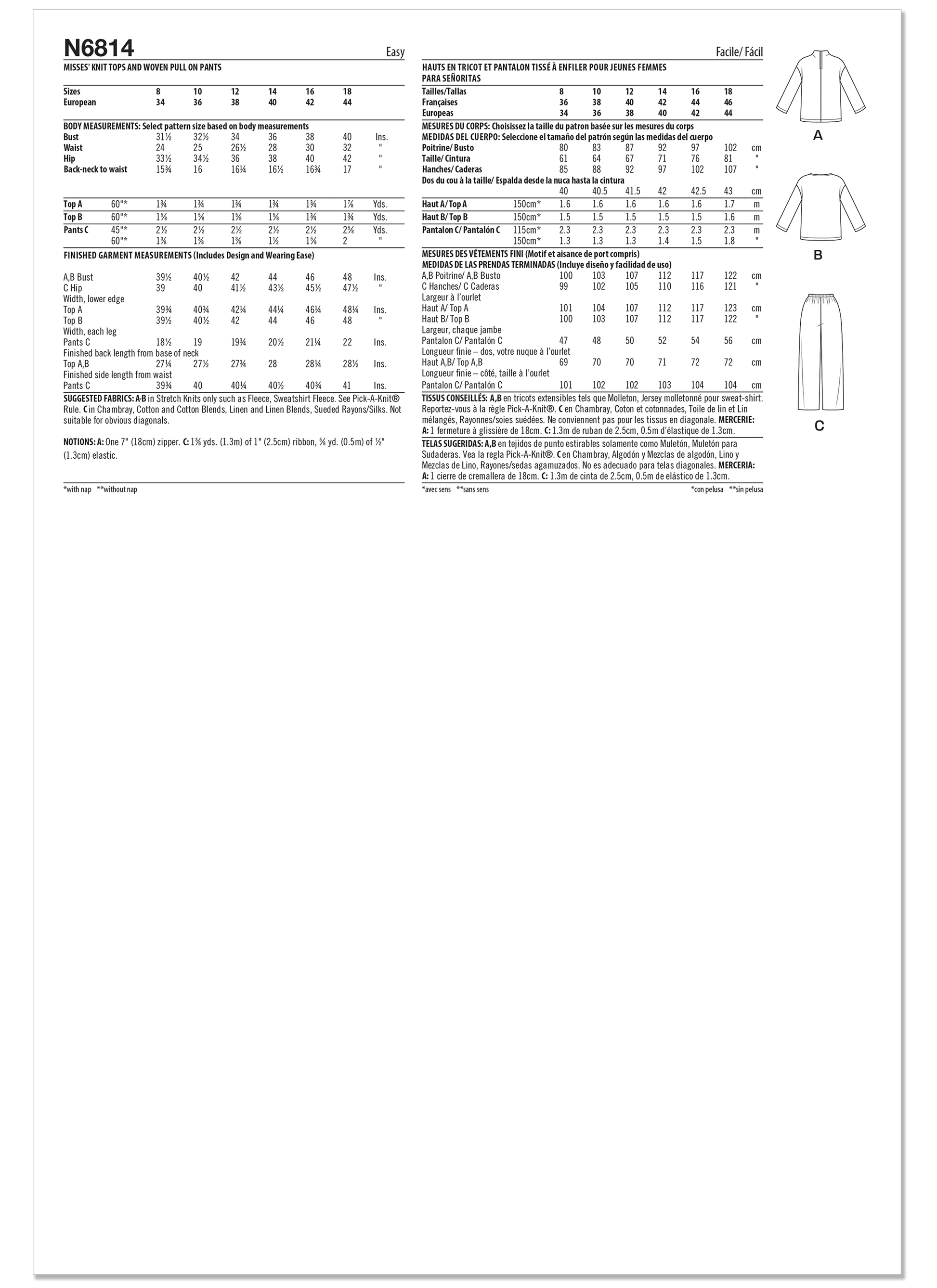Pullover knit tops have boxy fit, dropped shoulders and long sleeves. Funnel neck top has back neck zipper, front and back seaming and top stitched details. Wide round neck top has easy turned back hems. Relaxed fit pull-on full-length pants have applied ribbon casing for elasticized drawstring with fabric tie ends.