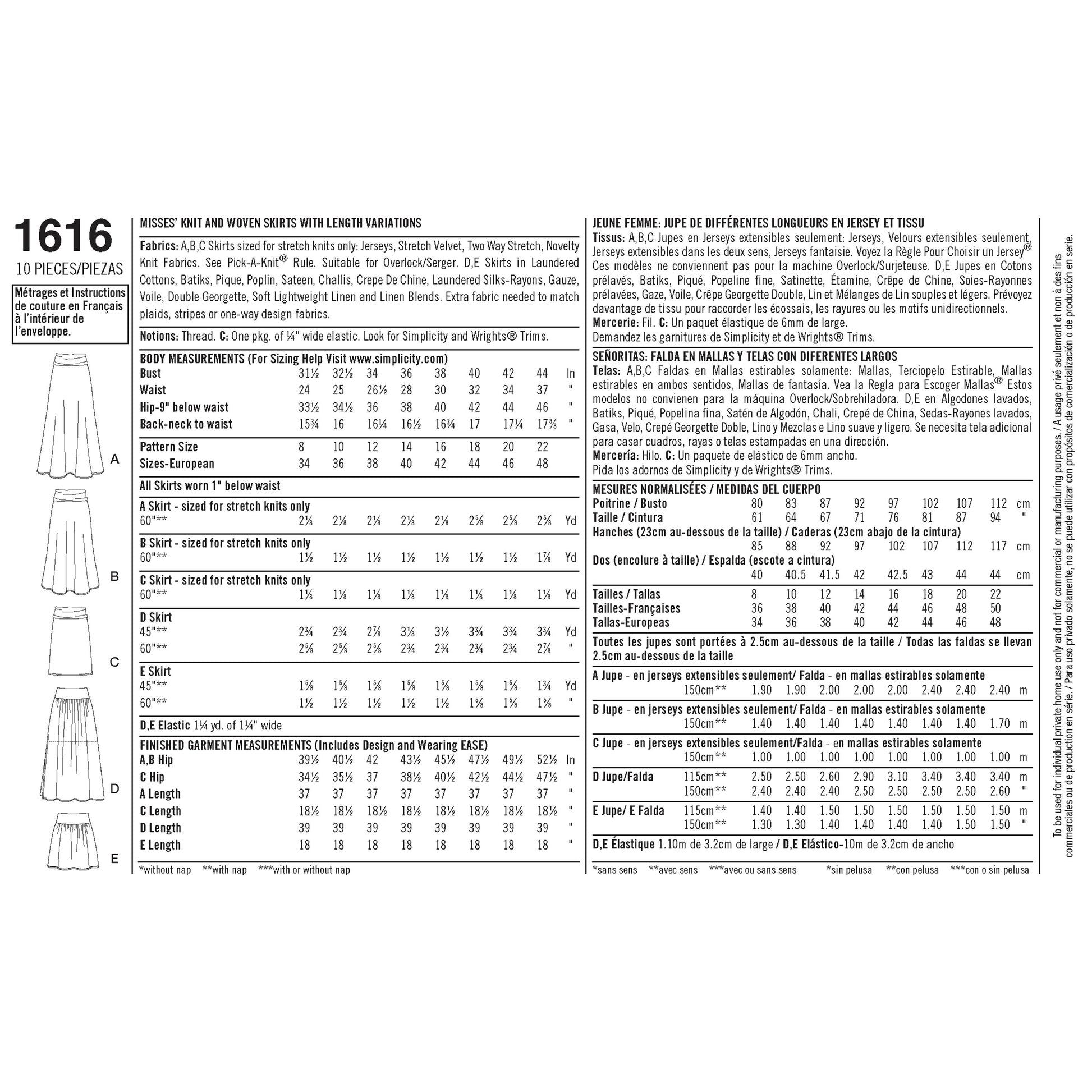 Women's knit or woven skirts feature flattering yokes with length and hemline variations. A, B, C suitable for knits can be made flared in maxi length or with hi-low hem or straight in knee length with front ruching detail. Pull on D, E suitable for woven fabrics have bias cut yoke and elastic waist has full gathered skirt in maxi or above knee length.