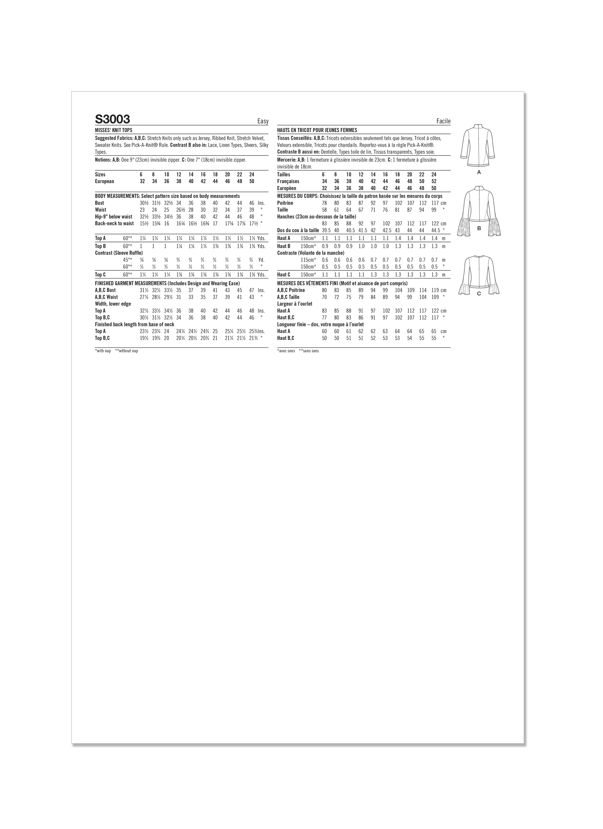 Easy to sew knit tops in two lengths have sleeve and neckline variations and invisible back zipper closure. View B has contrast sleeve ruffle.
