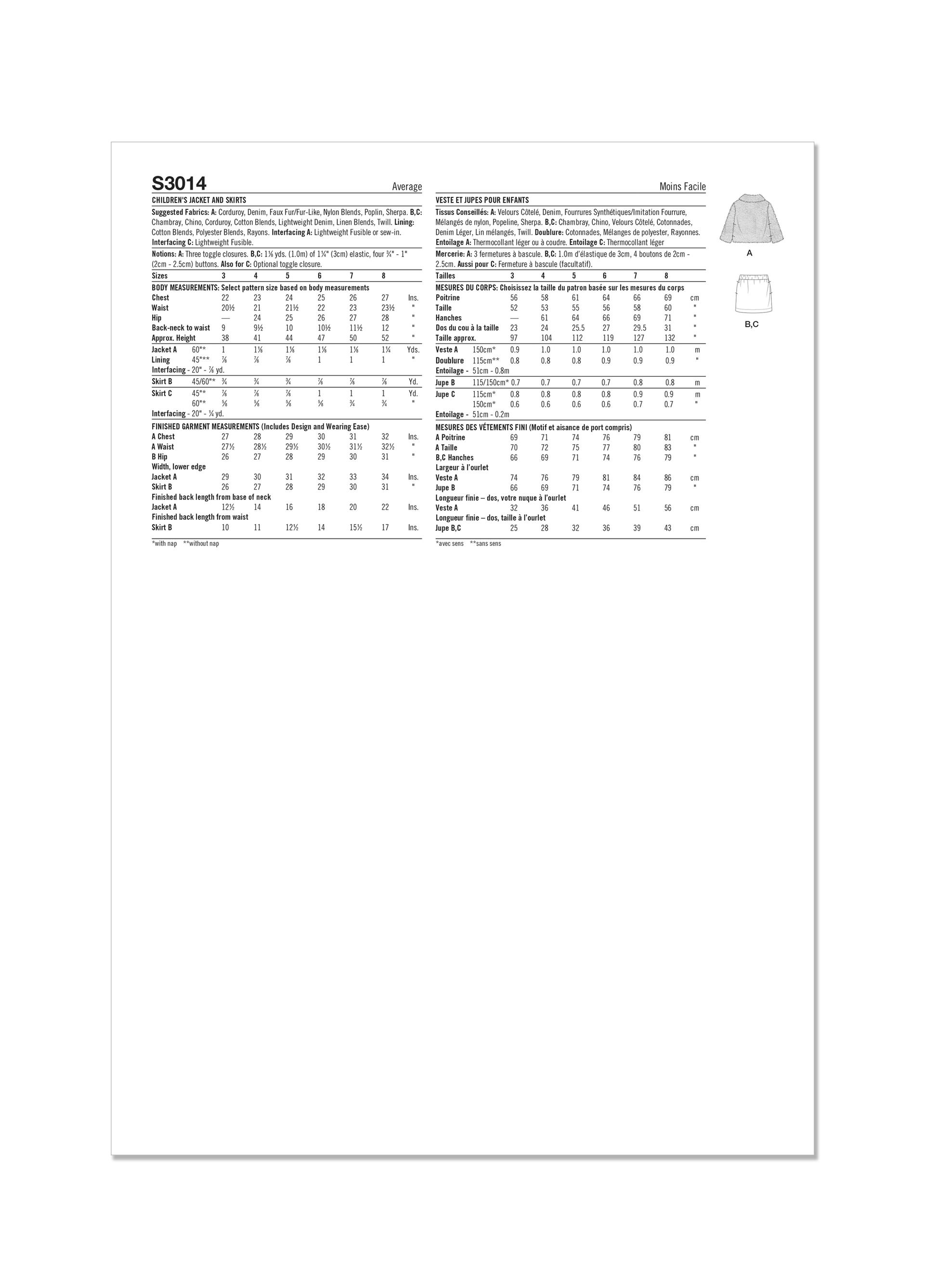 Relaxed fit jacket has front toggle closure, shaped collar, and side seam pockets. Pull-on skirts have elastic waistband, side seam pockets and front button detail. View C has front patch pocket with flap and optional toggle closure.