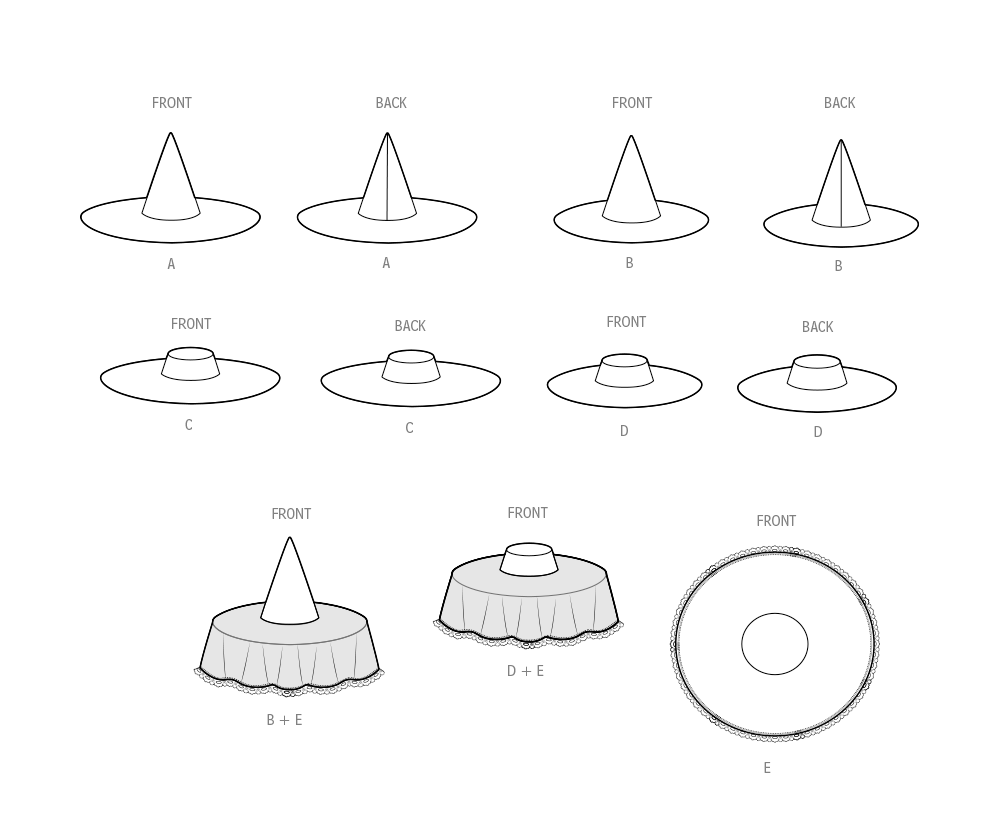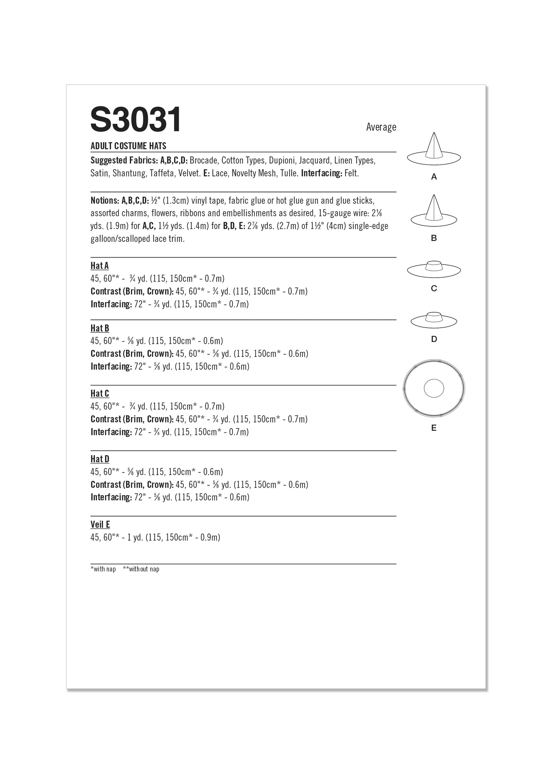 Hats with wired brims in two sizes and contrast under brims and linings are the perfect base for embellishments, creating a custom character accessory. Witch and wizard hats are wired at the back seam as well, allowing for unique molding and shaping. Flat top crown hat is perfect for historical and theater use. Single layer lace-trimmed veil slides easily over any hat for added drama. See envelope for more information.