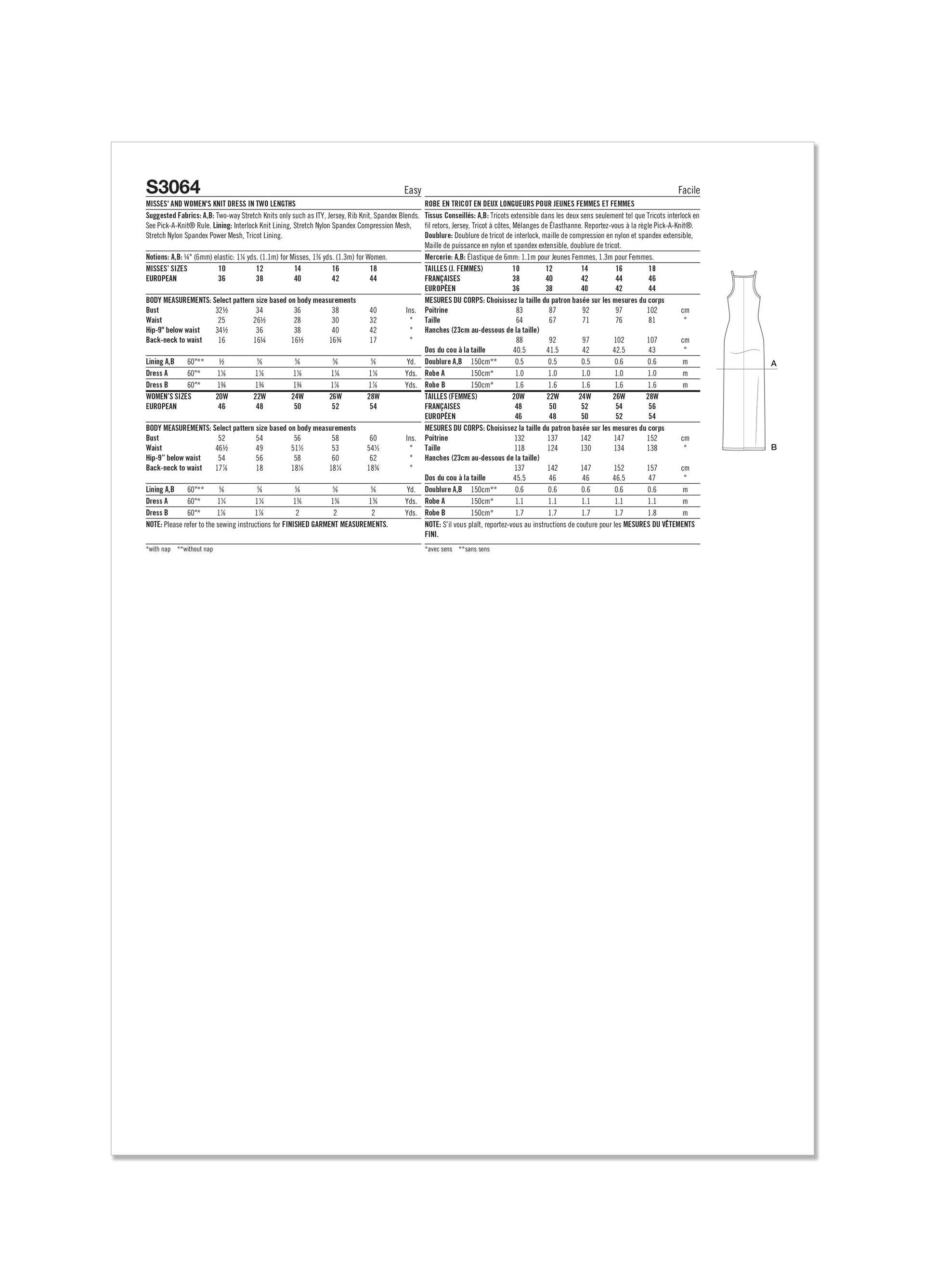 Close fit, knit dress in short or long floor length has racer back tank, built in shelf bra and self-binding around the neckline and armholes.