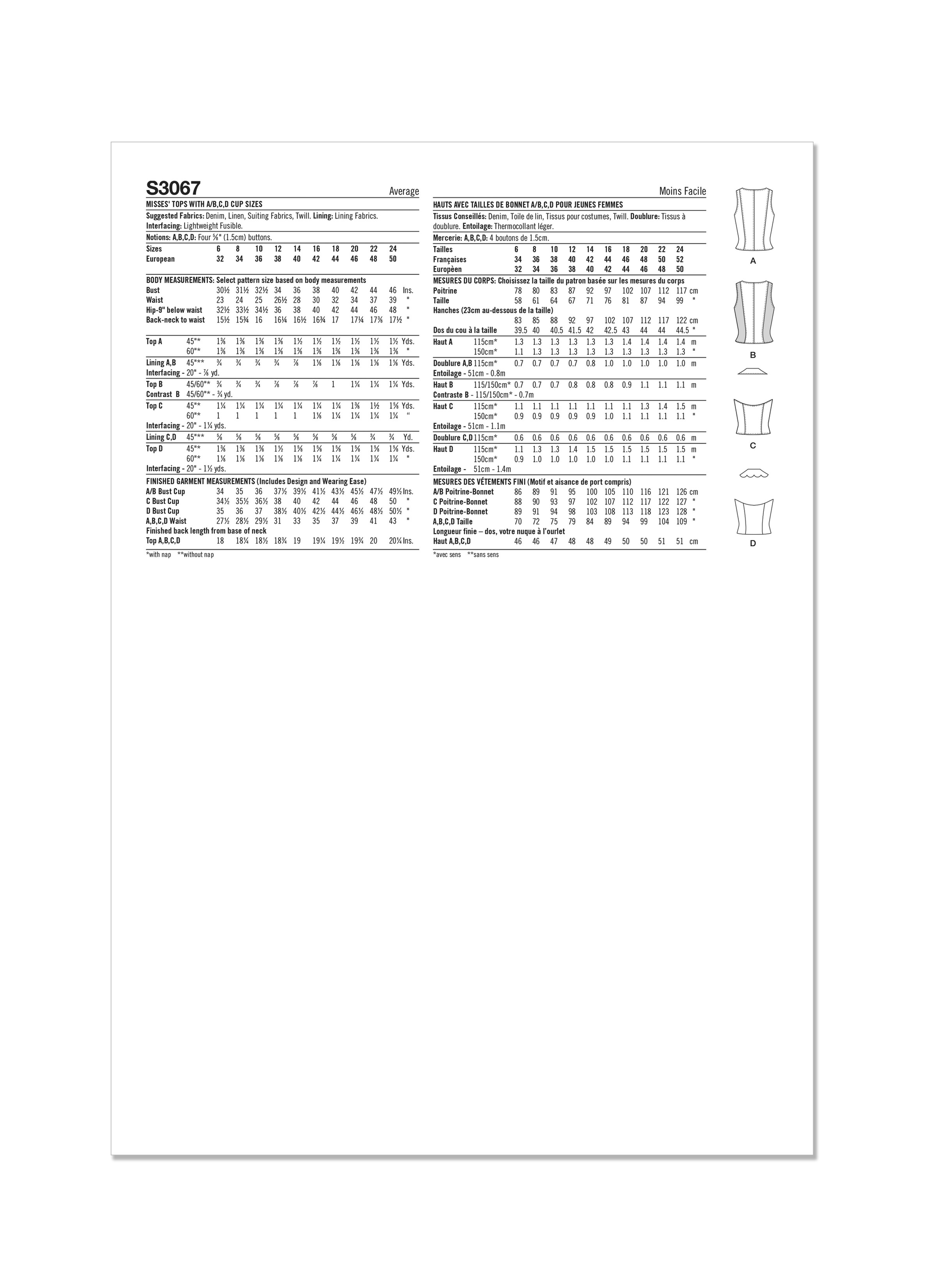 Vest style tops have button-front closure and lining. View B has contrast on the sides. Views C and D are halter vests with notched lapel collar and scalloped shawl collar. View B has contrast on the sides. Views A, B, and C have topstitching detail. Separate pattern pieces for A/B, C, D cup sizes.