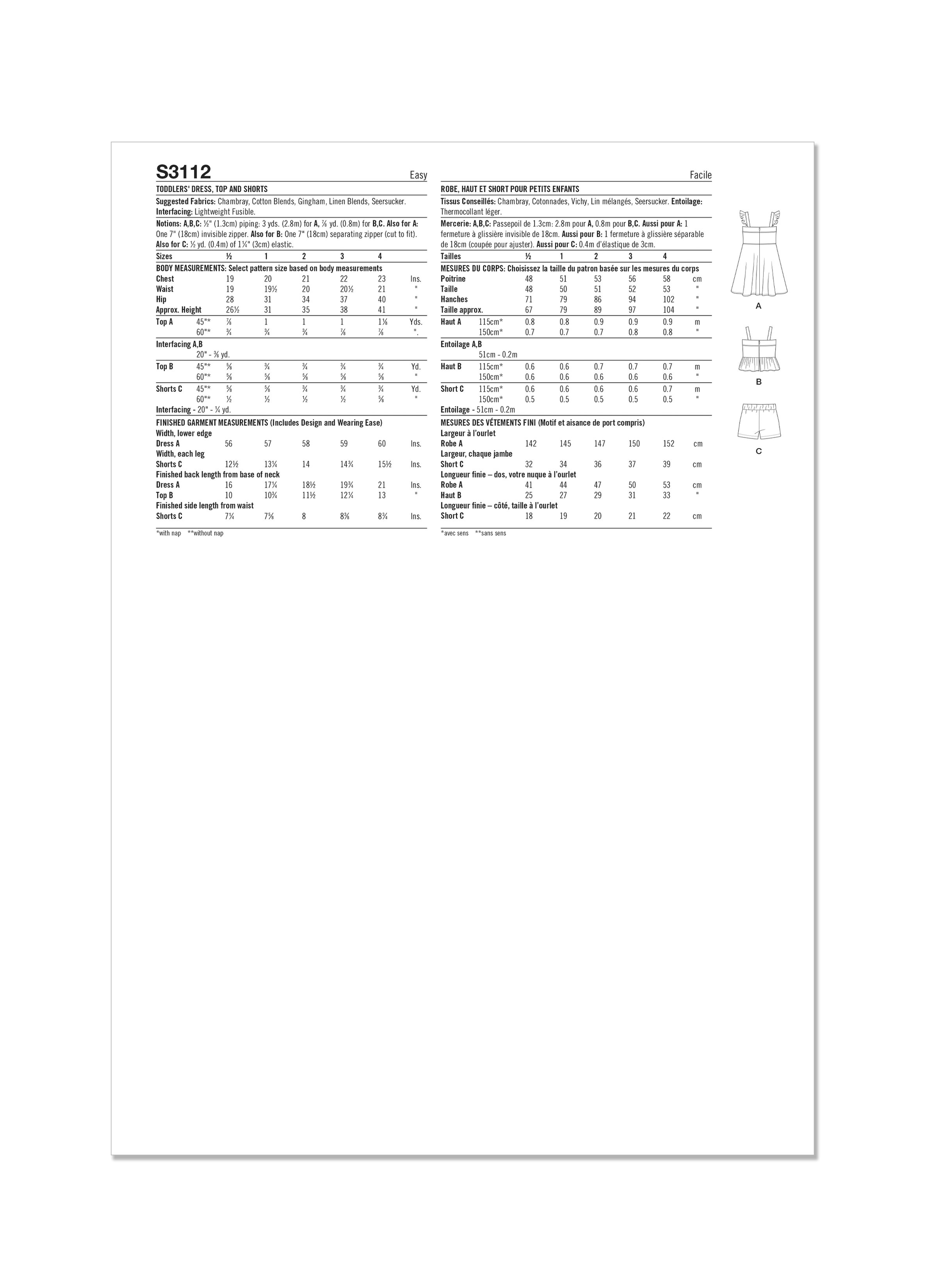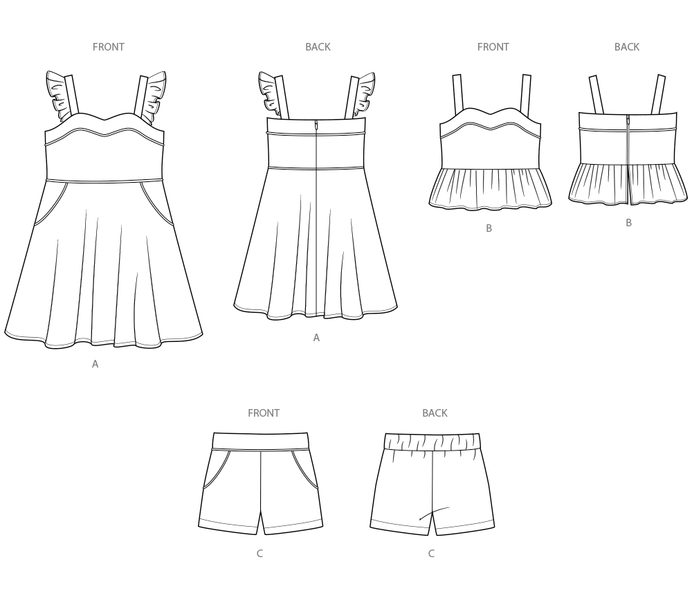 Dress and top have shaped neckband with purchased piping. Flare dress with flutter sleeves has piping at waist and pockets. Top has straps and gathers at waistline. Pull-on shorts have elastic at waist and piping at waist seam and pockets.