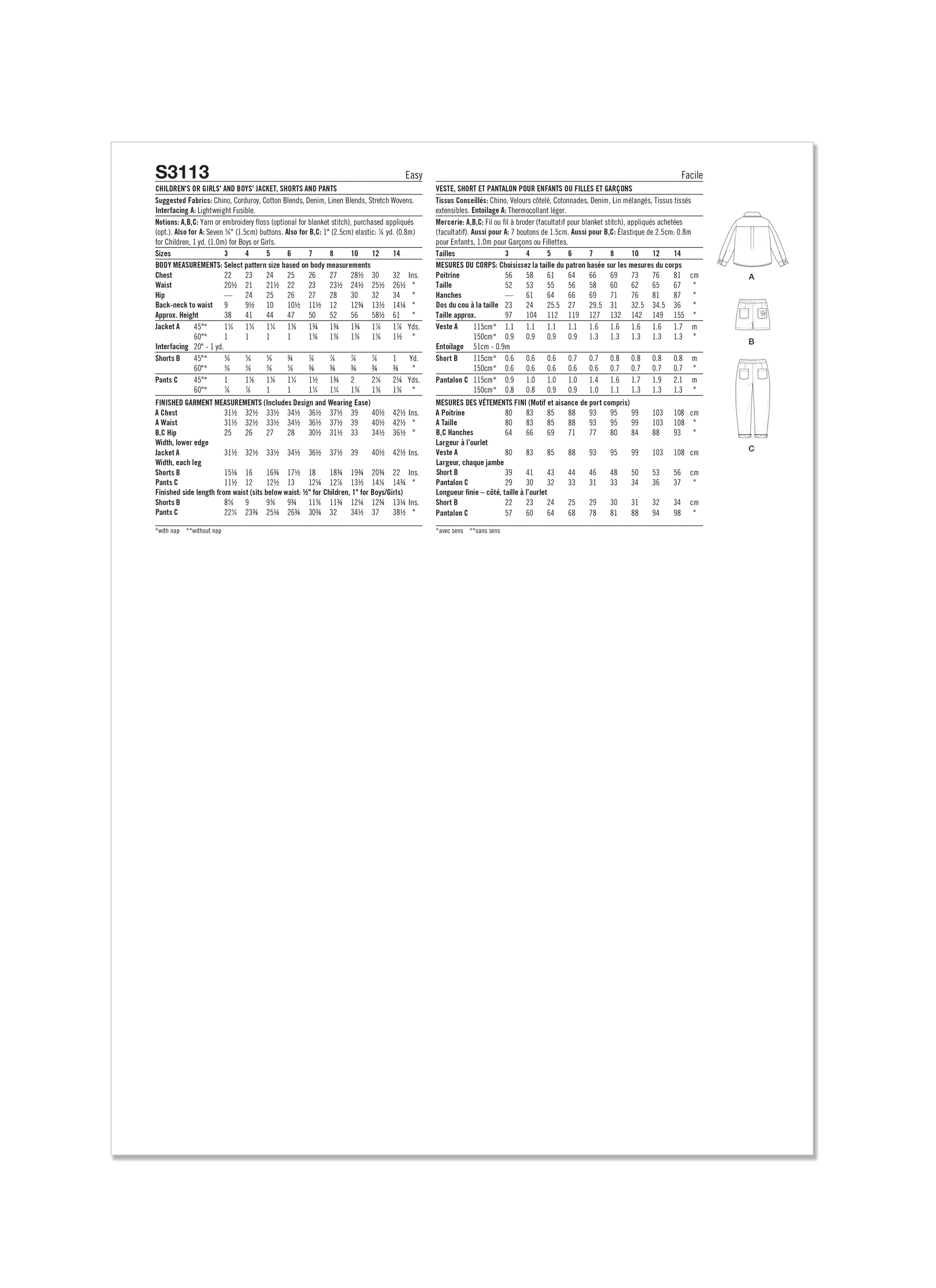 Stylish jacket with front button opening has dropped shoulders, front patch pockets, back yoke, and back box pleat. Collar and hem have yarn or floss stitching detail. Pull-on shorts and pants have elastic waistband, faux front fly and pockets with yarn or floss stitching detail. Optional purchased appliques. Purchase sizes separately.