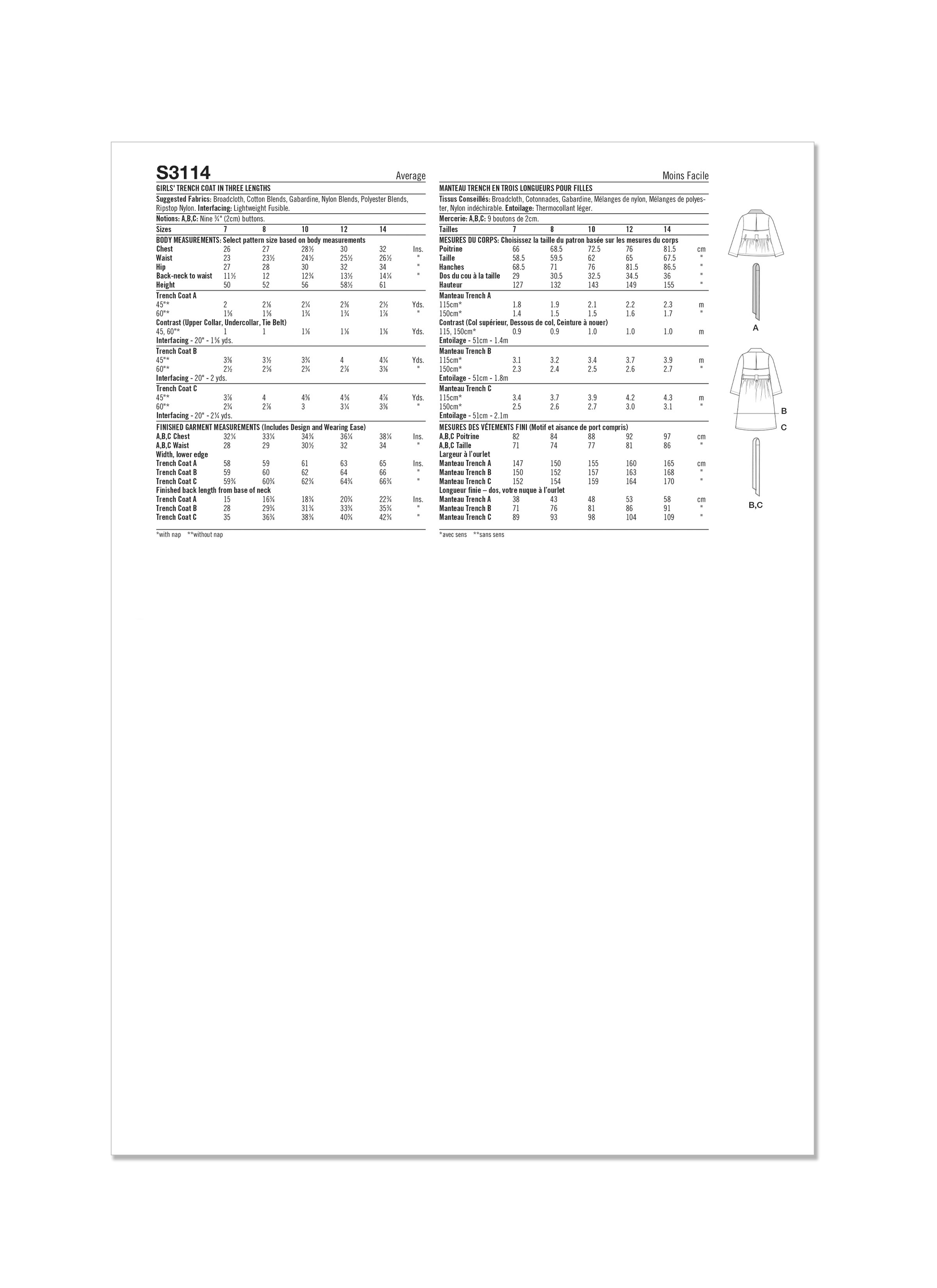 Double-breasted trench coats with tie belt have collar, rain fly, sleeve tabs, side seam pockets and gathers at sides and back waist. View A coat has contrast on collar and belt.