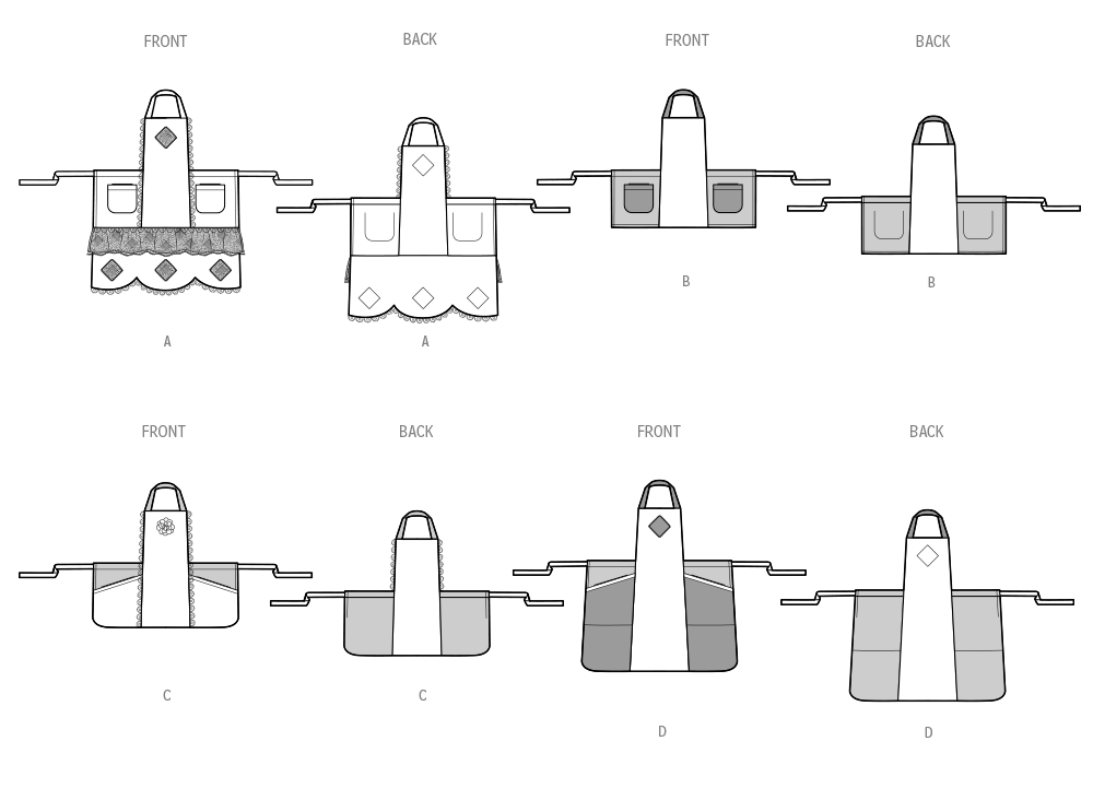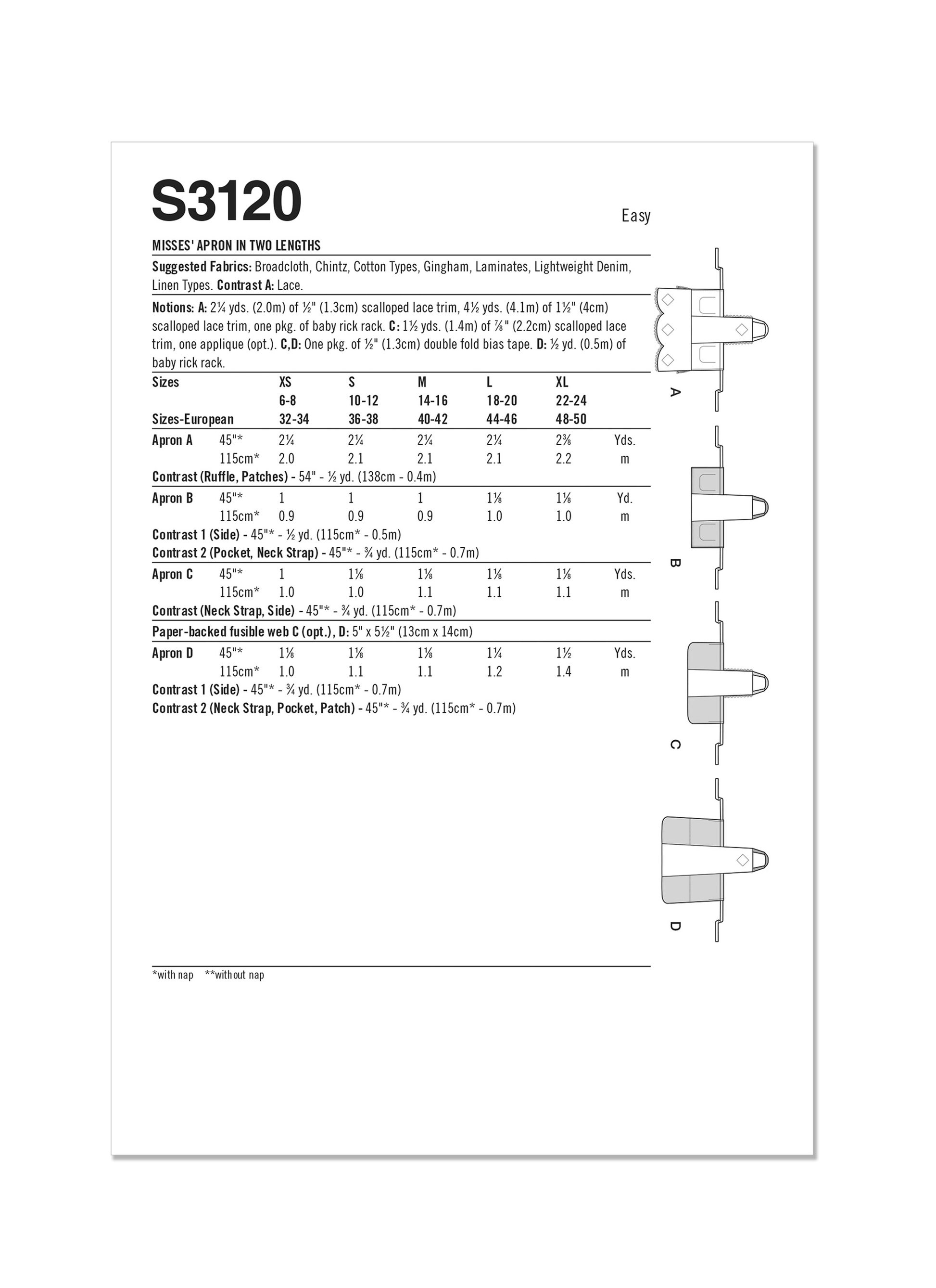 Aprons with wraparound side panels in above and below knee lengths have self-faced fronts with neck straps and side ties threaded through panel casings for adjustable fit. Apron with scalloped hem has patch pockets, lace trim and lace fabric ruffle and patches. Short aprons with contrast side panels and neck straps can be made with straight hem and patch pockets or curved hem with bias-bound oversized pockets and lace trim. Long apron with curved hem has contrast bias-bound oversized pockets and front patch. Instructions for creating an applique from fabric motif included. See envelope for more information.