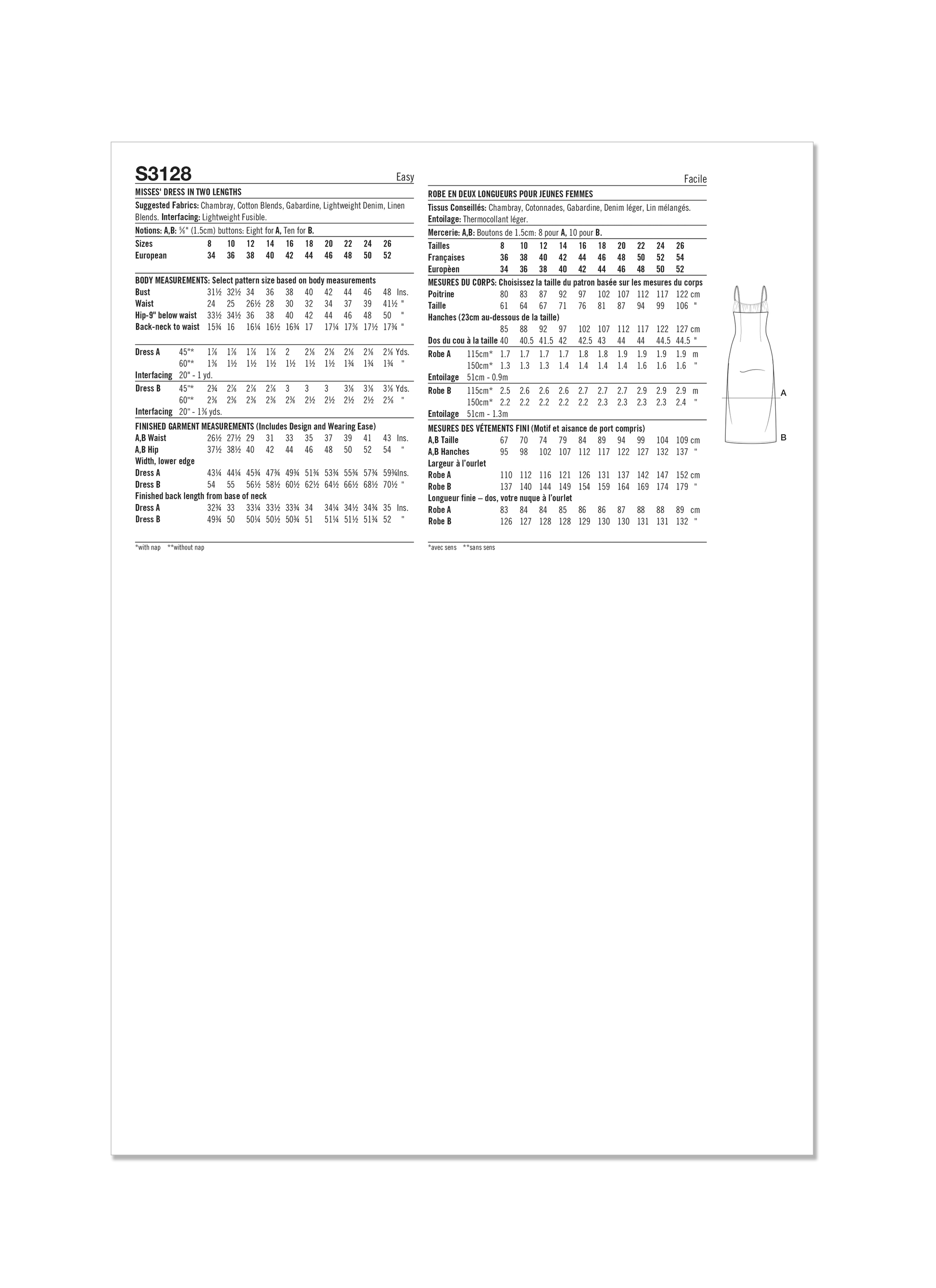Fitted dress in mini and midi length has gathered bust, ties enclosed in neckline casing, front button opening, front and back darts and shoulder straps.