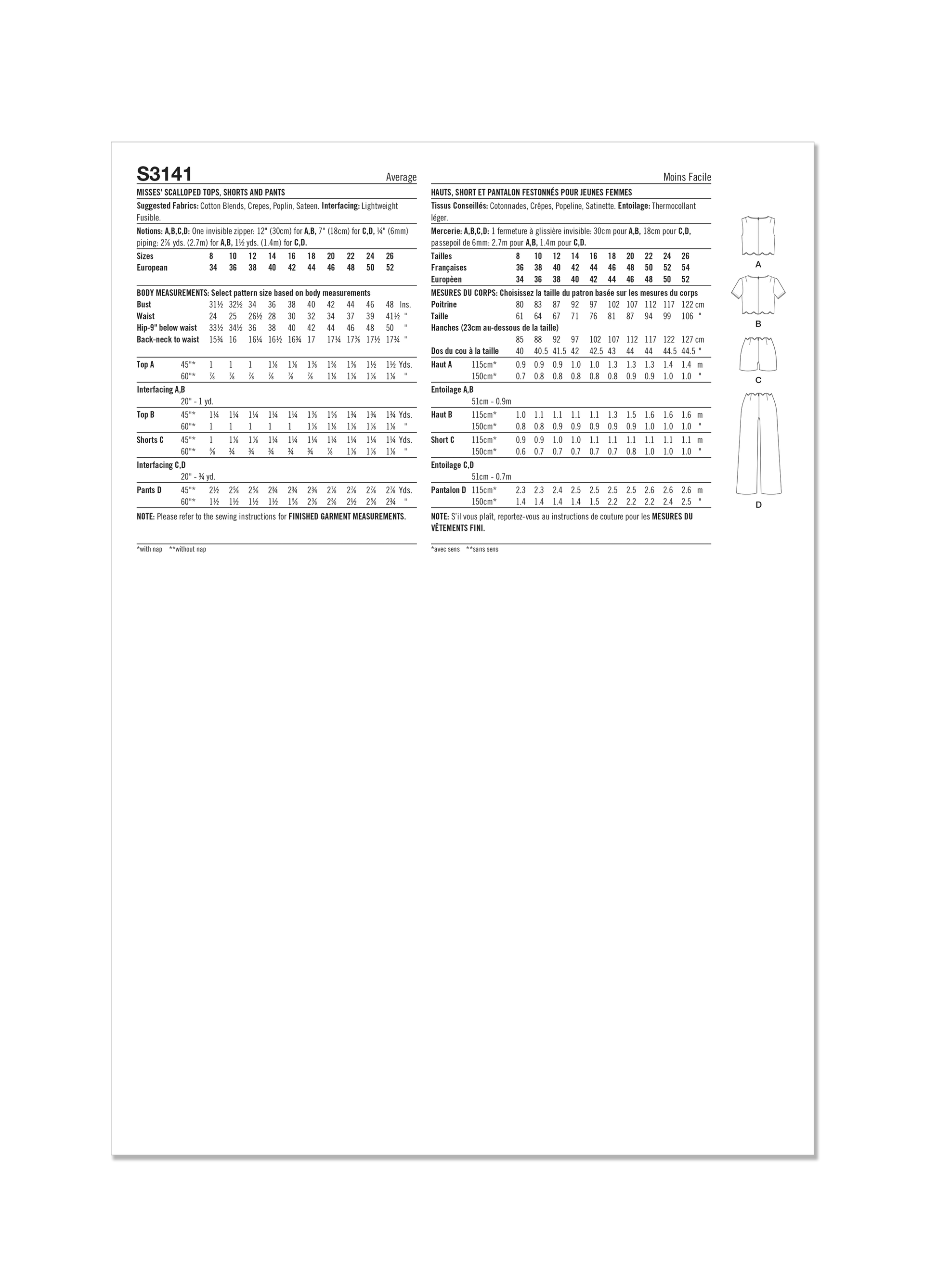 Fitted tops have scalloped hem and short sleeves or sleeveless option. Shorts and pants have scalloped waist. All views have purchased piping and invisible zipper closure.