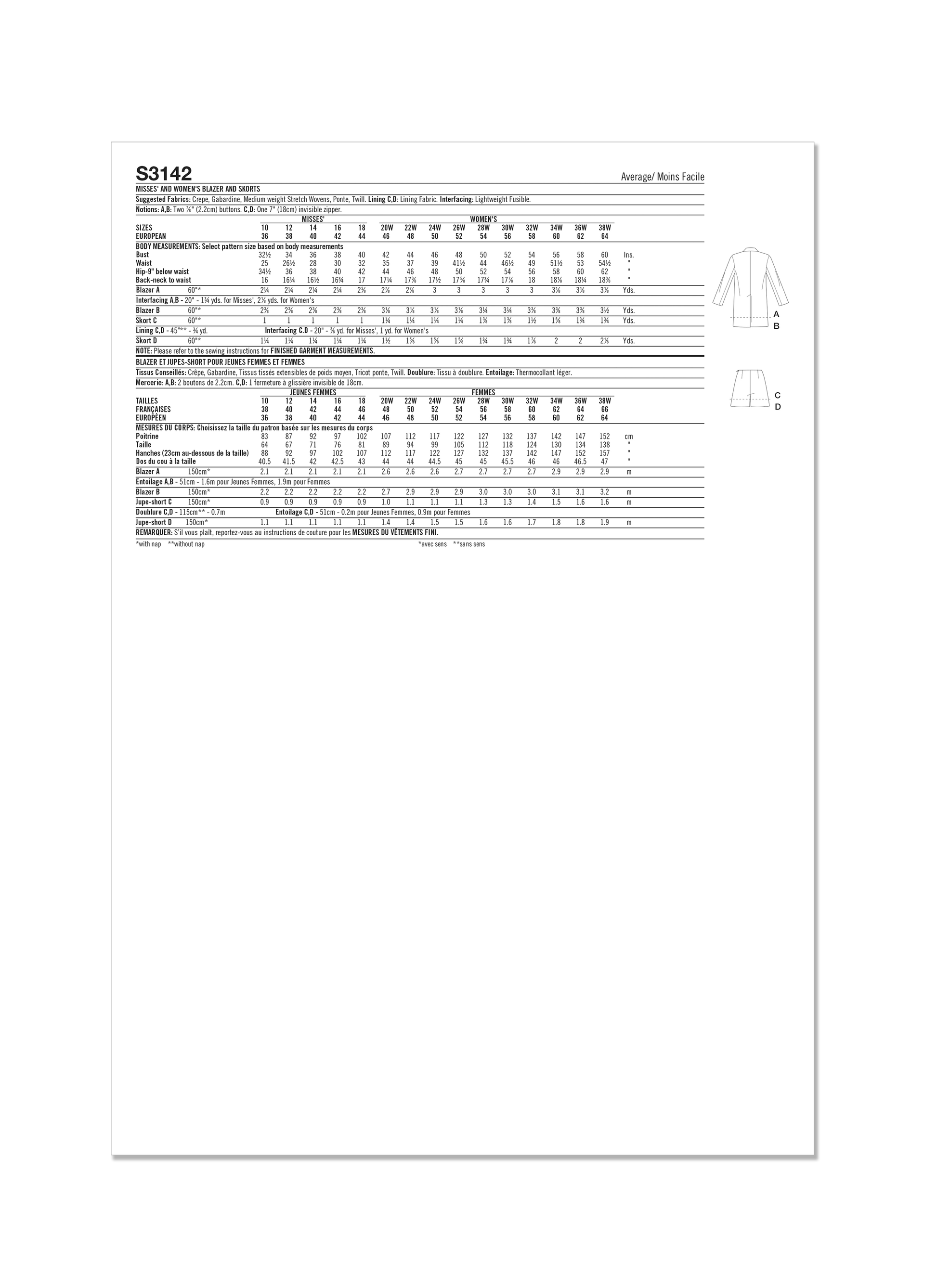 Loose-fitting, unlined blazer has notch collar, patch pockets, two-piece sleeves, back vent and length variations. Fitted, asymmetric front skort has back waist darts, invisible side zipper and length variations.