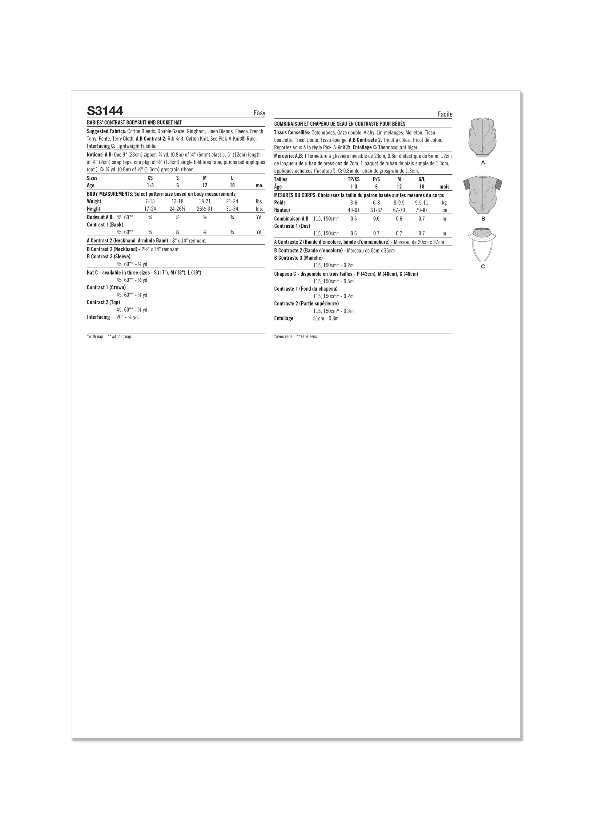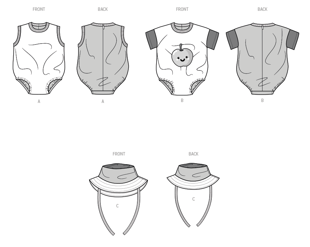 Adorable babiesÕ bodysuit with short sleeve and sleeveless option have elastic at legs, rib knit neckband, contrast back, invisible zipper closure and optional purchased appliques. View B bodysuit has contrast sleeves. Bucket hat has purchased grosgrain ribbon and comes in three sizes S-M-L.