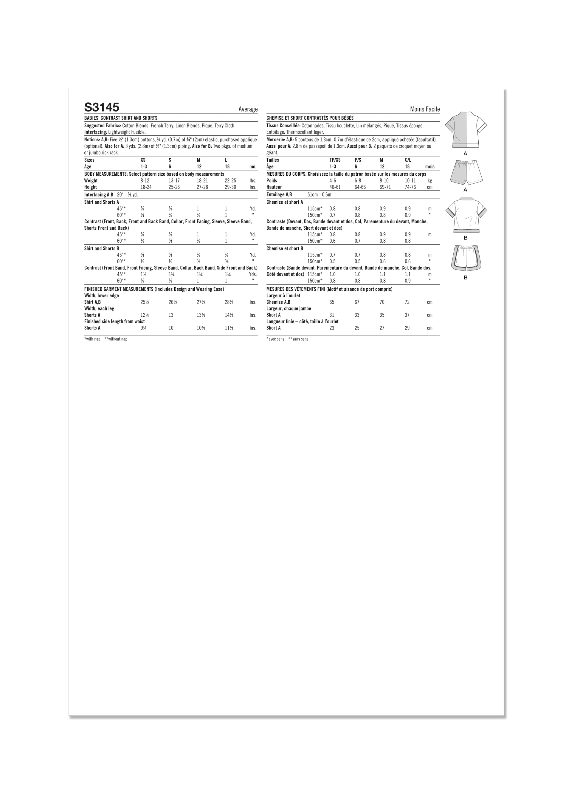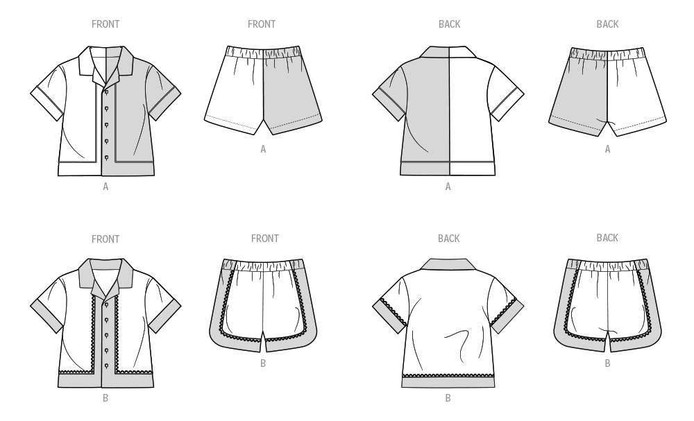 Short sleeve shirt has collar, front button opening, optional applique, purchased piping or rick rack trim. Pull on shorts have elastic waistband.