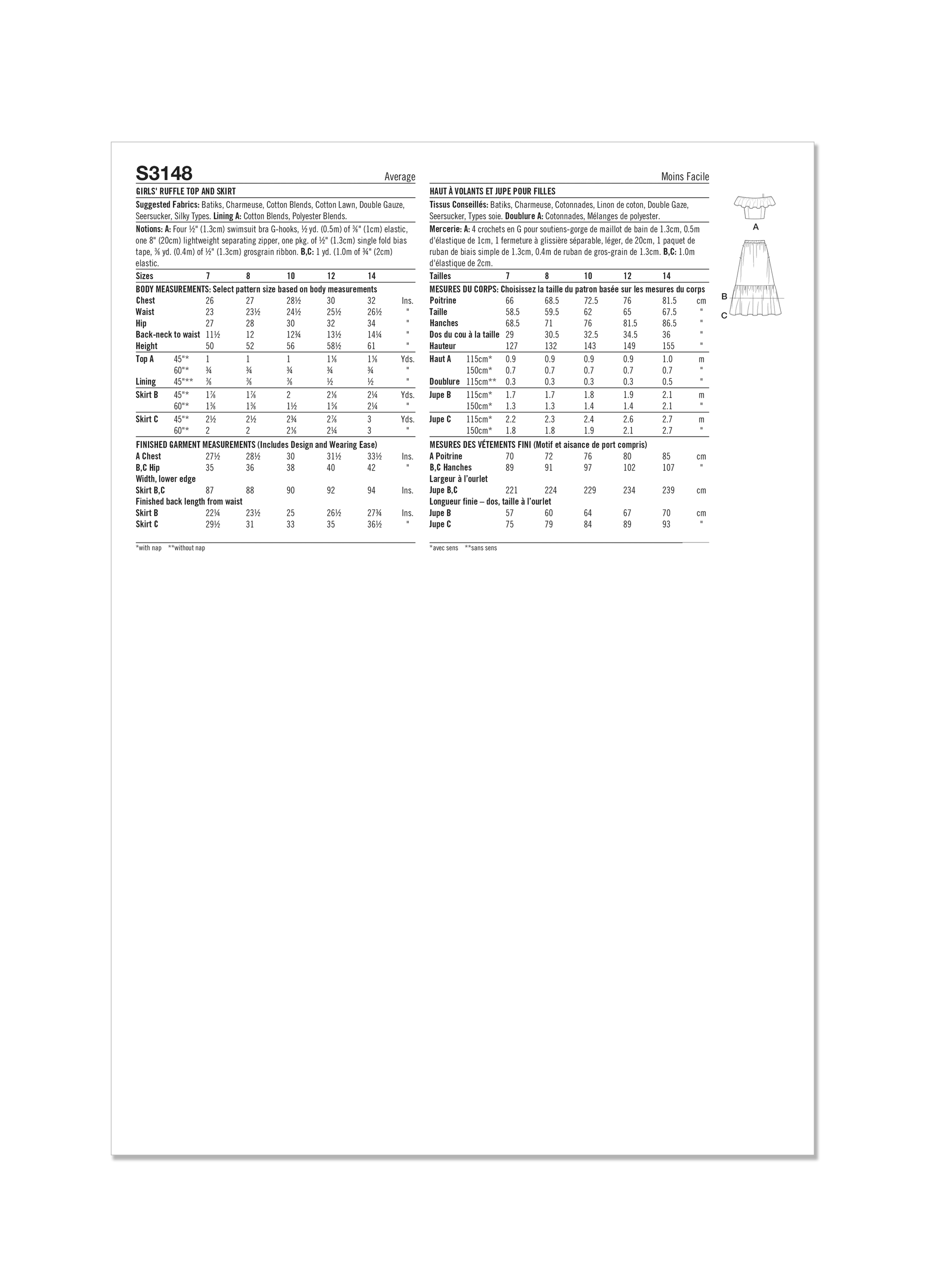 Girls' off the shoulder top has princess seams and ruffle neckline with or without spaghetti straps. Midi or ankle length skirt has elastic waistband and gathered ruffle hem.
