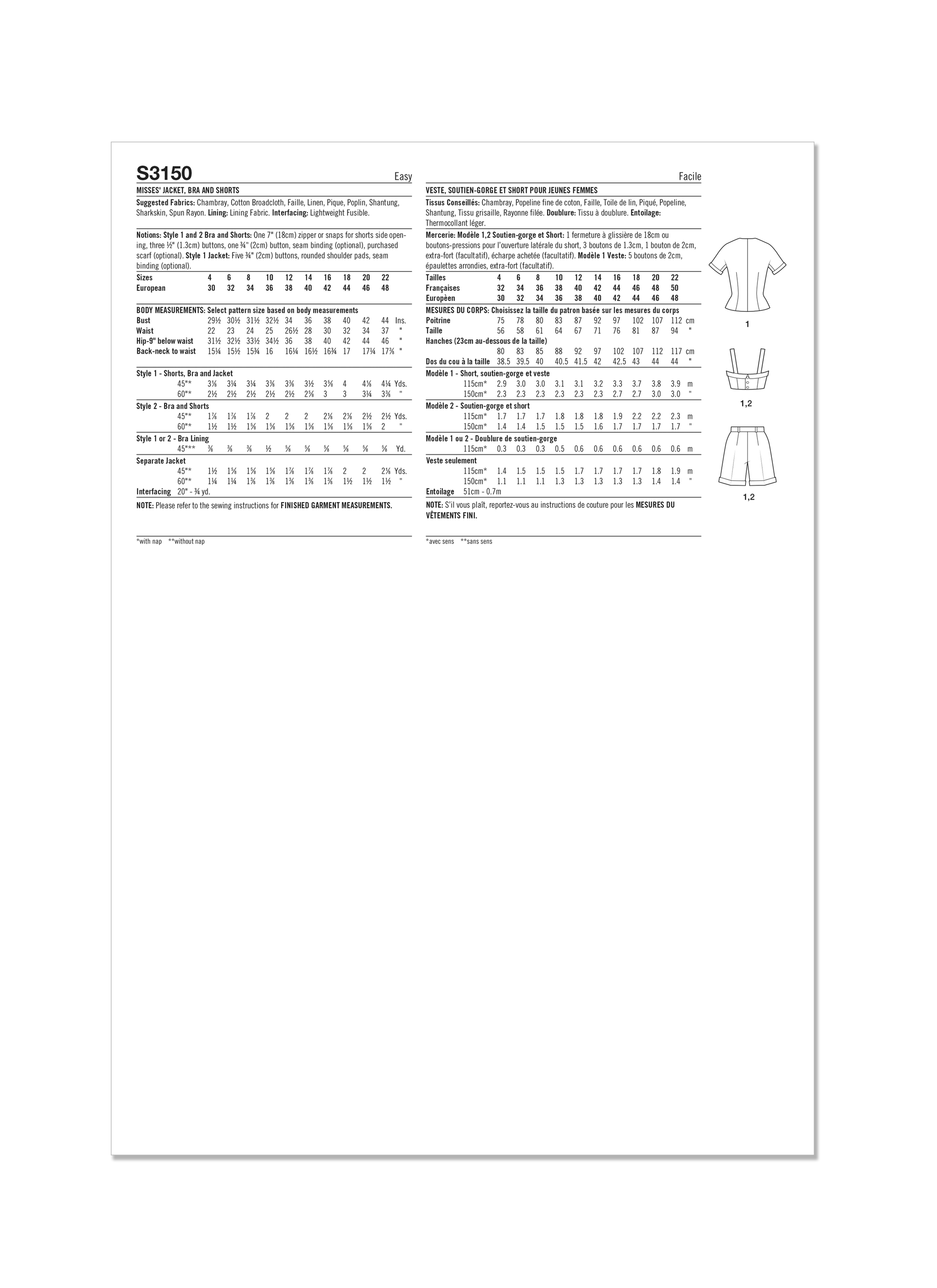 Vintage Simplicity 1940's jacket, bra and shorts pattern. The slim shorts are fitted with darts at the back. A side closing, side entrance pockets and turn back cuffs are featured. Style 2 may have a purchased scarf slipped through the belt carriers at the waistline. The dart fitted bra buttons down the back and features wide shoulder straps. A bias fold trims the upper edge. The front buttoning jacket fitted with darts, has short, kimono sleeves trimmed with cuffs. Authentic Vintage Reproduction includes additional sizes and cutting layouts.