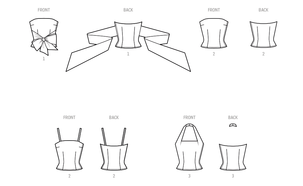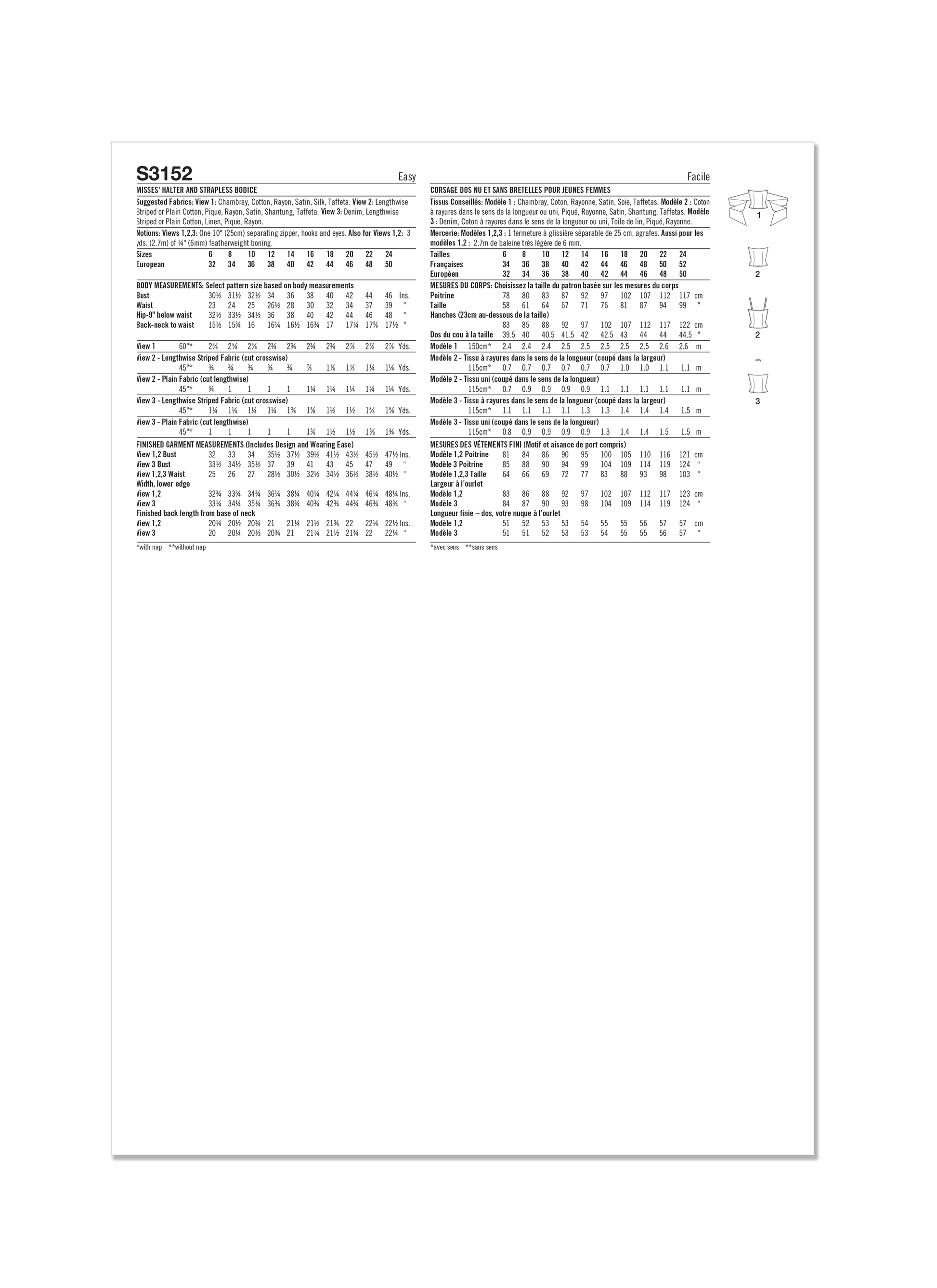 Vintage Simplicity 1950's halter and strapless bodice pattern. The fitted strapless bodice in View 1 is styled with a wide sash joined to bodice at side seams, wraps around waistline and ties in front. View 2 may be worn with or without straps. View 3 is a halter. All views have a zipper side closing and side seams are open 2" from lower edge. Authentic Vintage Reproduction includes additional sizes and cutting layouts.