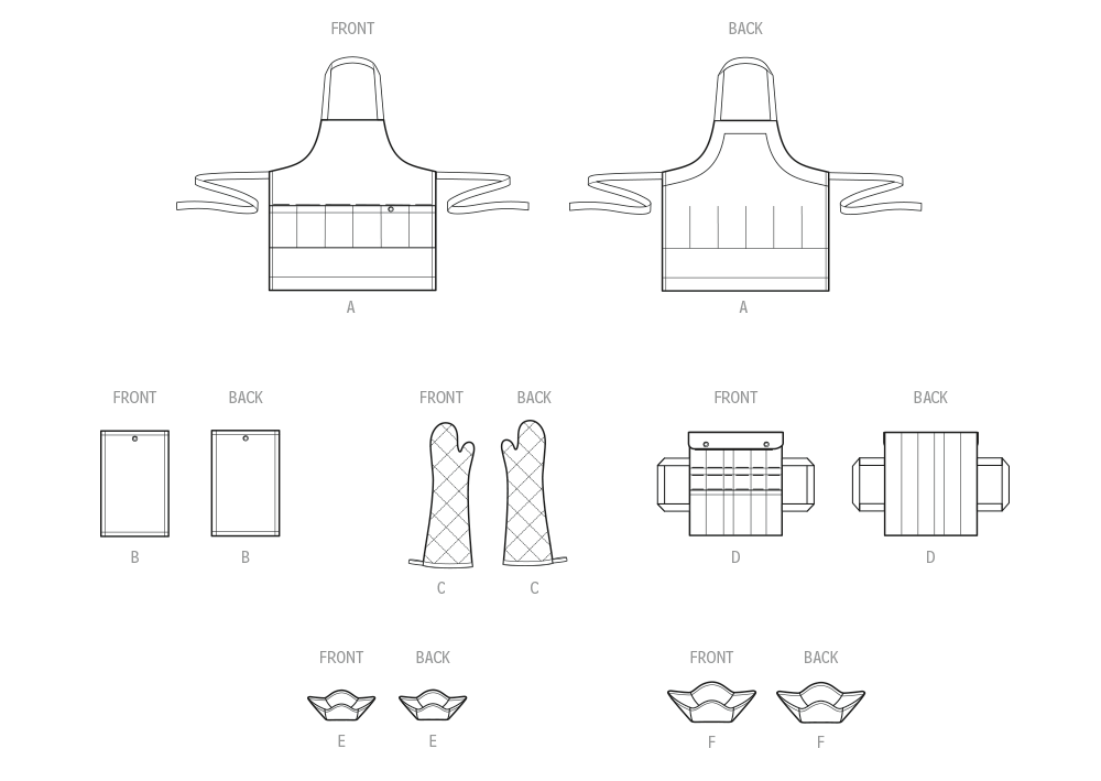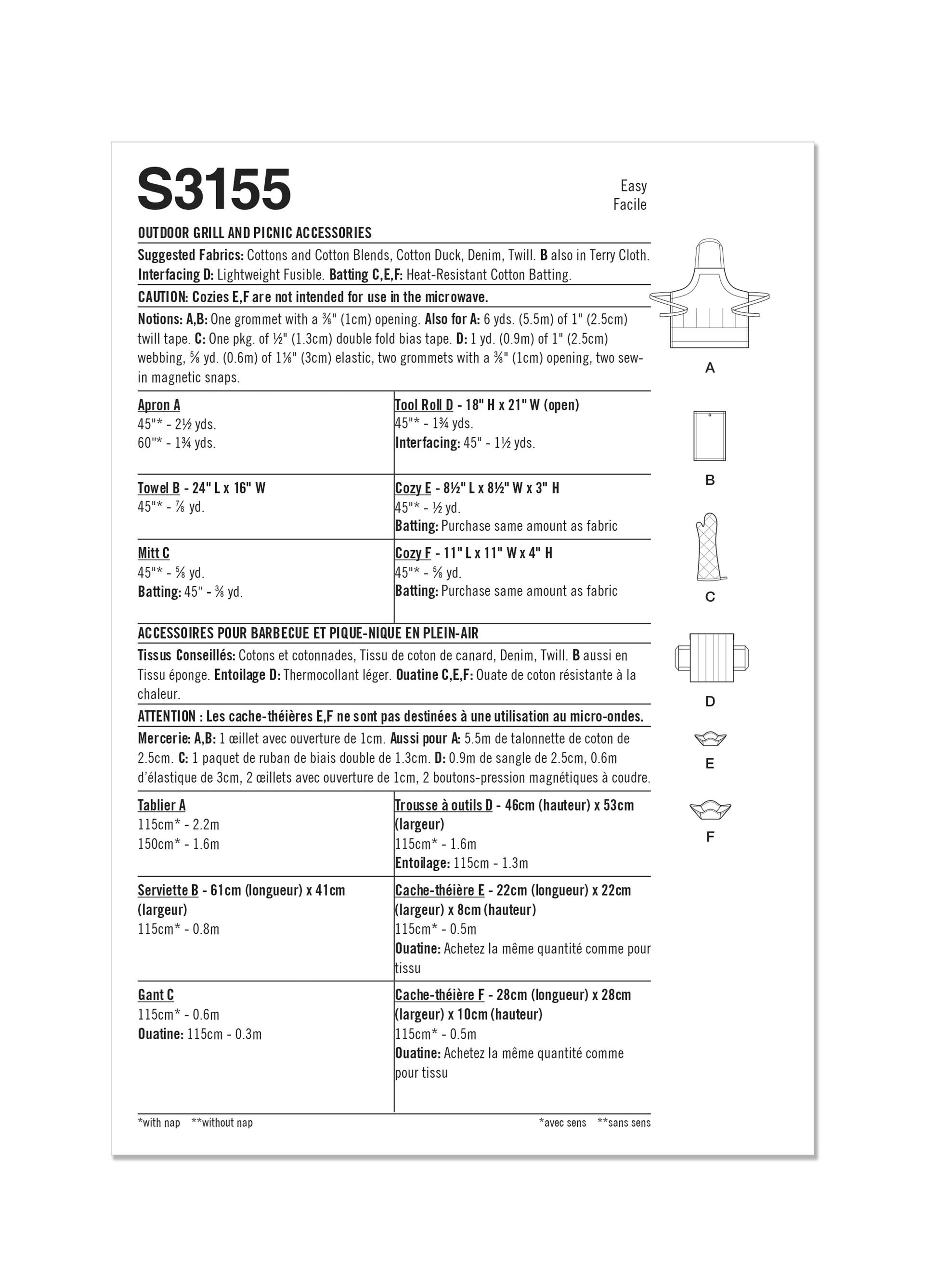 Summer essentials for the grill master includes apron, hand towel, grilling mitt, grilling tool roll and fabric cozies. One-size-fits-most apron has twill tape neck strap and ties, multi-use pockets and grommet for hanging towel. Extra-long grilling mitt has quilting and bias tape bound edge and loop. Tool roll designed to carry everything from tongs to skewers has elastic banding and flap with grommets and magnetic snaps to keep tools in place; roll folds in half with webbing handles for easy carrying. Fabric cozies with heat-resistant batting are sized for popular bowls and containers. See envelope for more information.