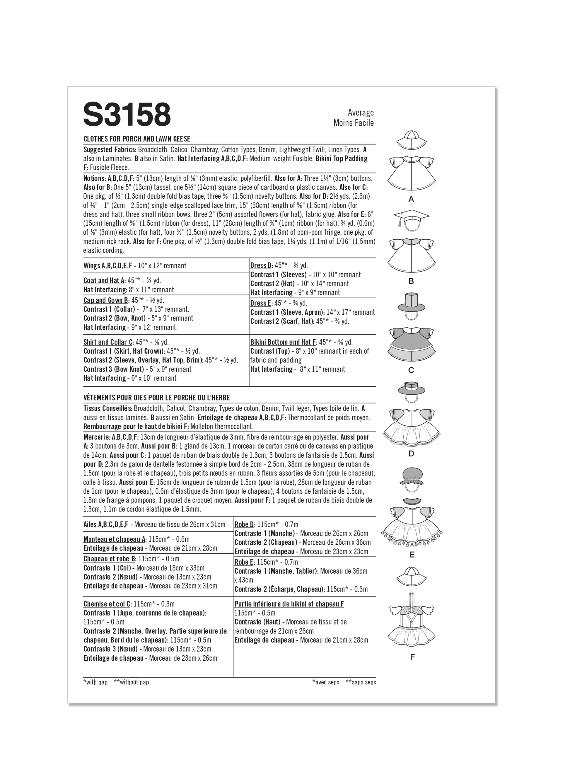 Fun summer outfits for 23" (59cm) porch geese include raincoat and hat, graduate, patriotic characters, summer dress and hat and bikini. All clothes slide easily over goose heads; hats have elastic bands to stay in place. Raincoat has button trim and patch pockets. Grad has contrast collar, bow tie and tassel-trimmed hat. Patriotic couple has contrast collars, hats, assorted trims and novelty buttons. Summer dress has lace trim, gathered skirt and flower-trimmed hat. Bikini has elasticized bottom and bias tape straps. Instructions included for separate, lightly stuffed wings. See envelope for more information.
