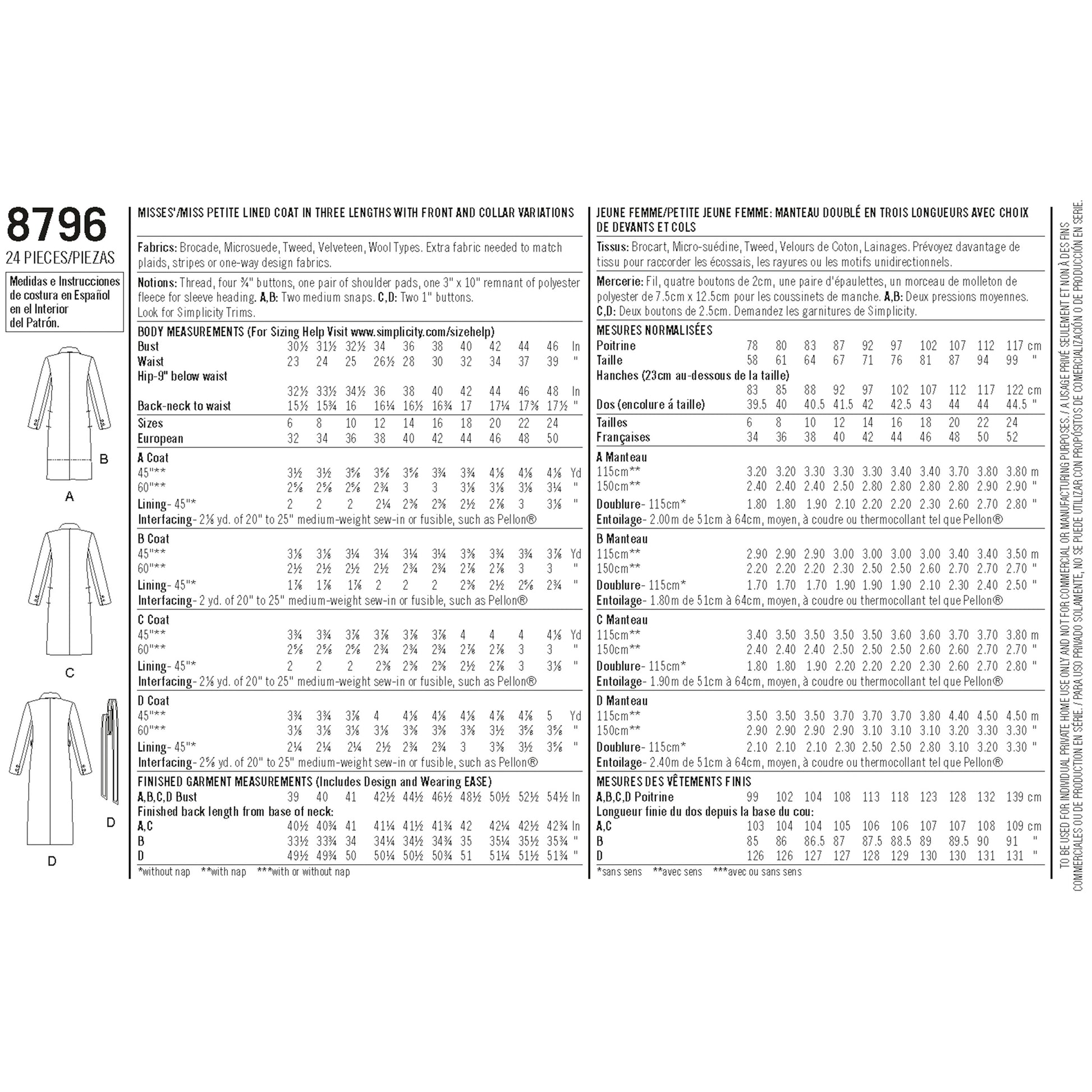 A coat for every occasion, with any length you desire. YouÕll always look chic and refined in this MIssesÕ Petite Lined Coat. The classic tie-waist band and optional side pocket gives you options to explore different sleek and minimal looks. Simplicity sewing pattern.