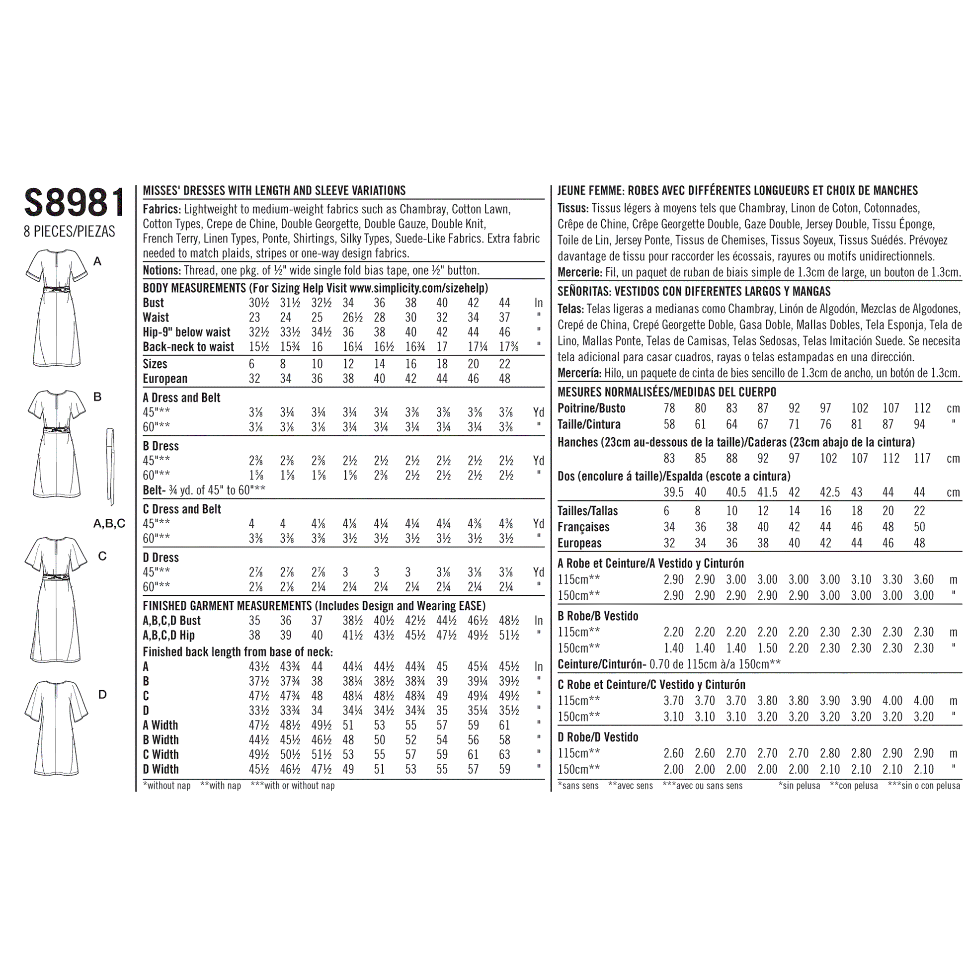 Simplicity Sewing Pattern-US8981H5-MISSES-DRESS-Easy to Sew Misses' Dresses. Pull-on style with centre front and back seams, fastens at back neck. Obi-style belt. Dress and sleeve length variations. Suitable for light-to-medium weight fabrics.