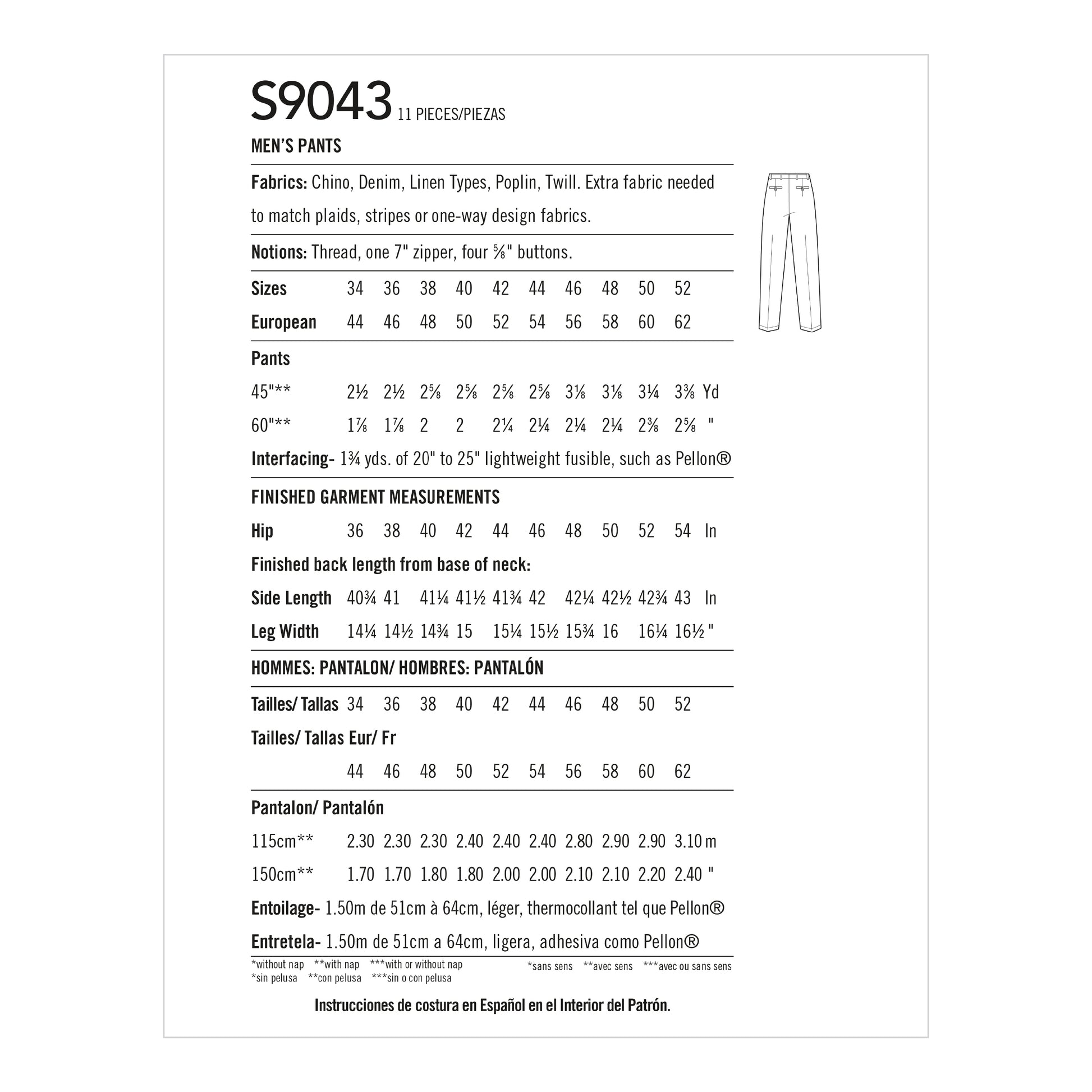 Simplicity Sewing Pattern S9043 -AA (34-36-38-40-42)-Men's Pants from Mimi Gee Style. Tailored, straight leg with front pleats, side and back pockets. Zipper fly and button closure, belt loops.