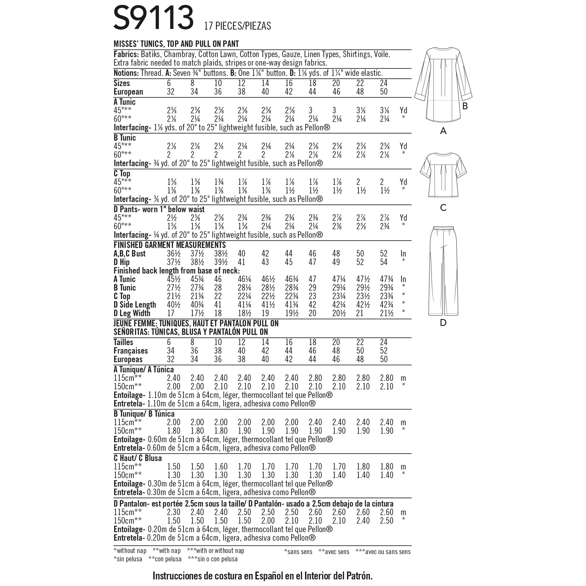Simplicity Sewing Pattern SS9113- H5 (6-8-10-12-14) women,tops-vests,skirts-pants, Misses' button front tunic and tops, short and long sleeves. Pull-on pants, have partical elastic waist and front pockets.