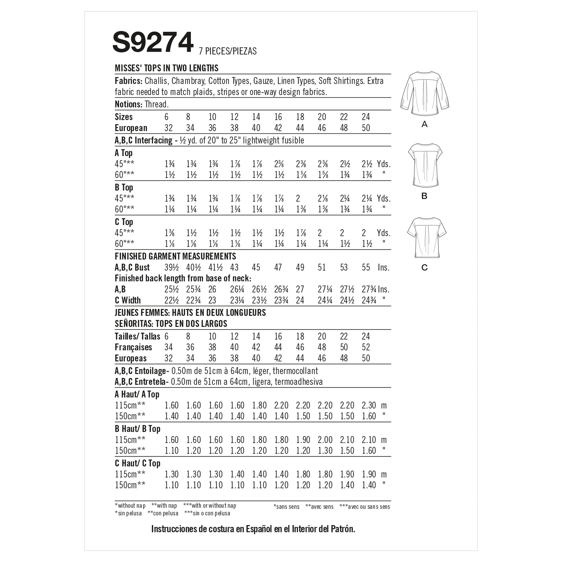 Misses' tops have round neckline with notched detail, drop shoulders, sleeve variations & straight or shaped hems.