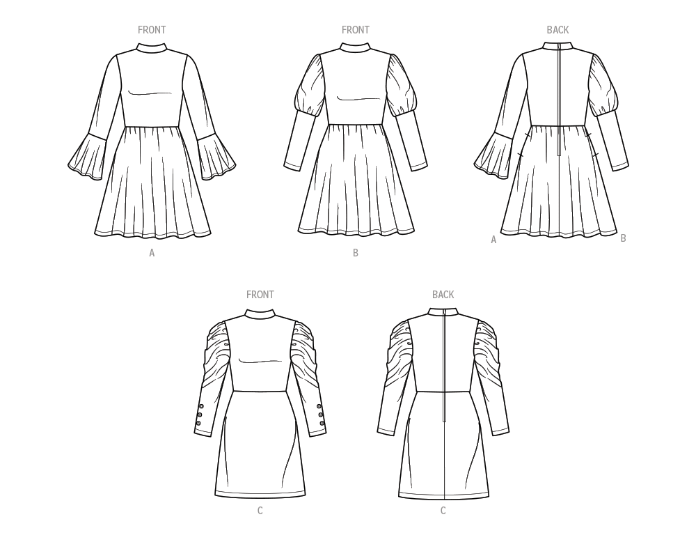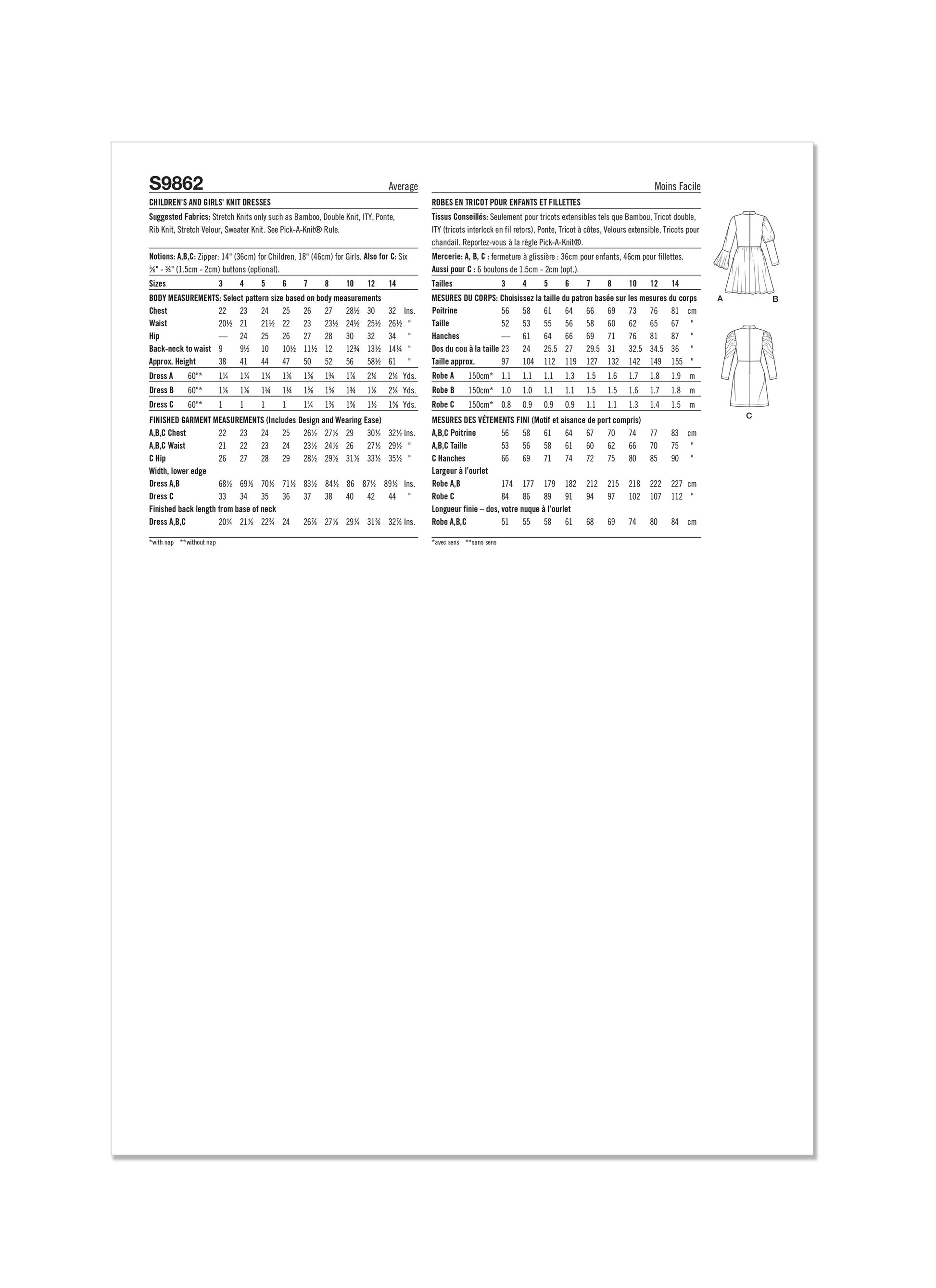 Children's and girls' knit dress with sleeve and skirt variations, high neckband and center back zipper. Long sleeve style options include flounce, juliet and gathered sleeve cap with decorative buttons. Skirt options include gathered with a flare plus side seam pockets and A-line.