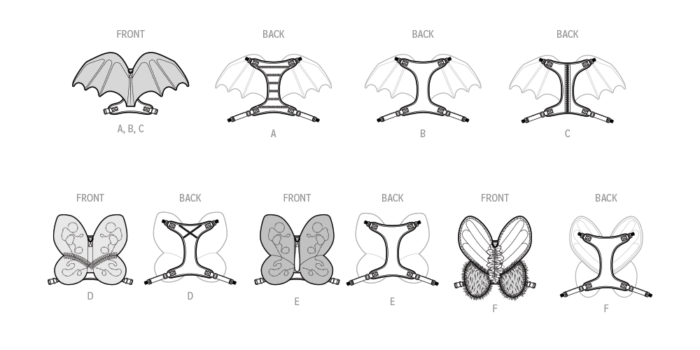 Lightly-padded harnesses for dogs in three sizes with parachute clip closures, adjustable webbing straps and D-rings for leash attachment have bias-tape finished edges and lightly-padded wings. Large wings with stitched skeleton effects can be dragon, bat or devil characters. Butterfly and fairy wings have sheer overlays, encasing battery-operated LED fairy lights. Angel wings have novelty trim and lower wing overlays. See envelope for more information.