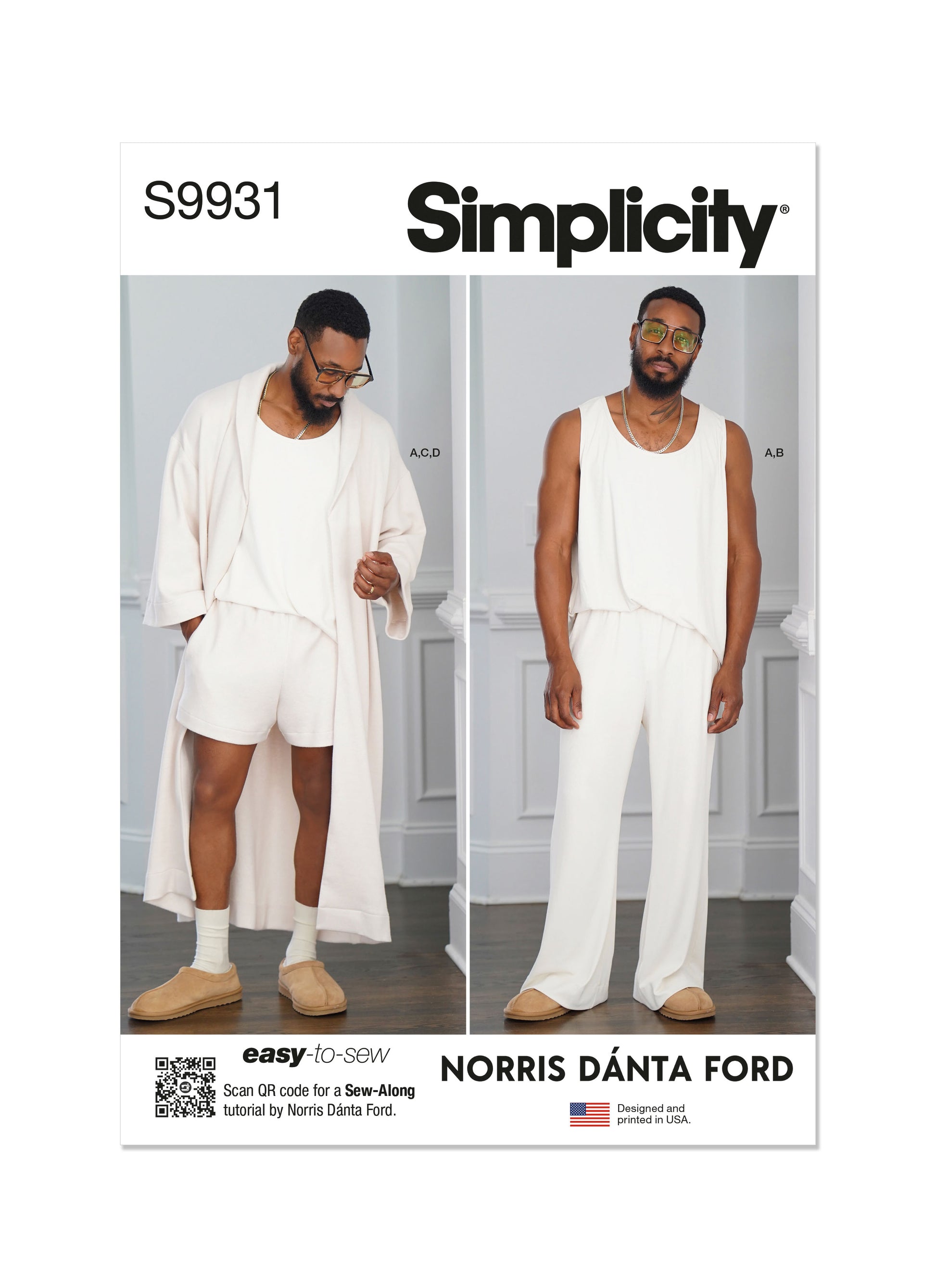 Comfy and stylish, create this easy to sew lounge set for Men. Pattern includes robe, tank top, pants and shorts. Oversized fit robe has dropped shoulder sleeves and belt. Pull-on pants and shorts have elastic waistband and side pockets.