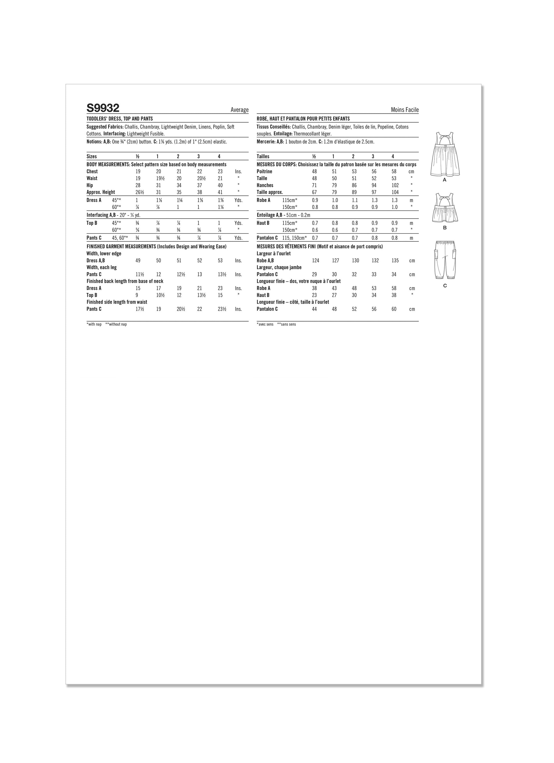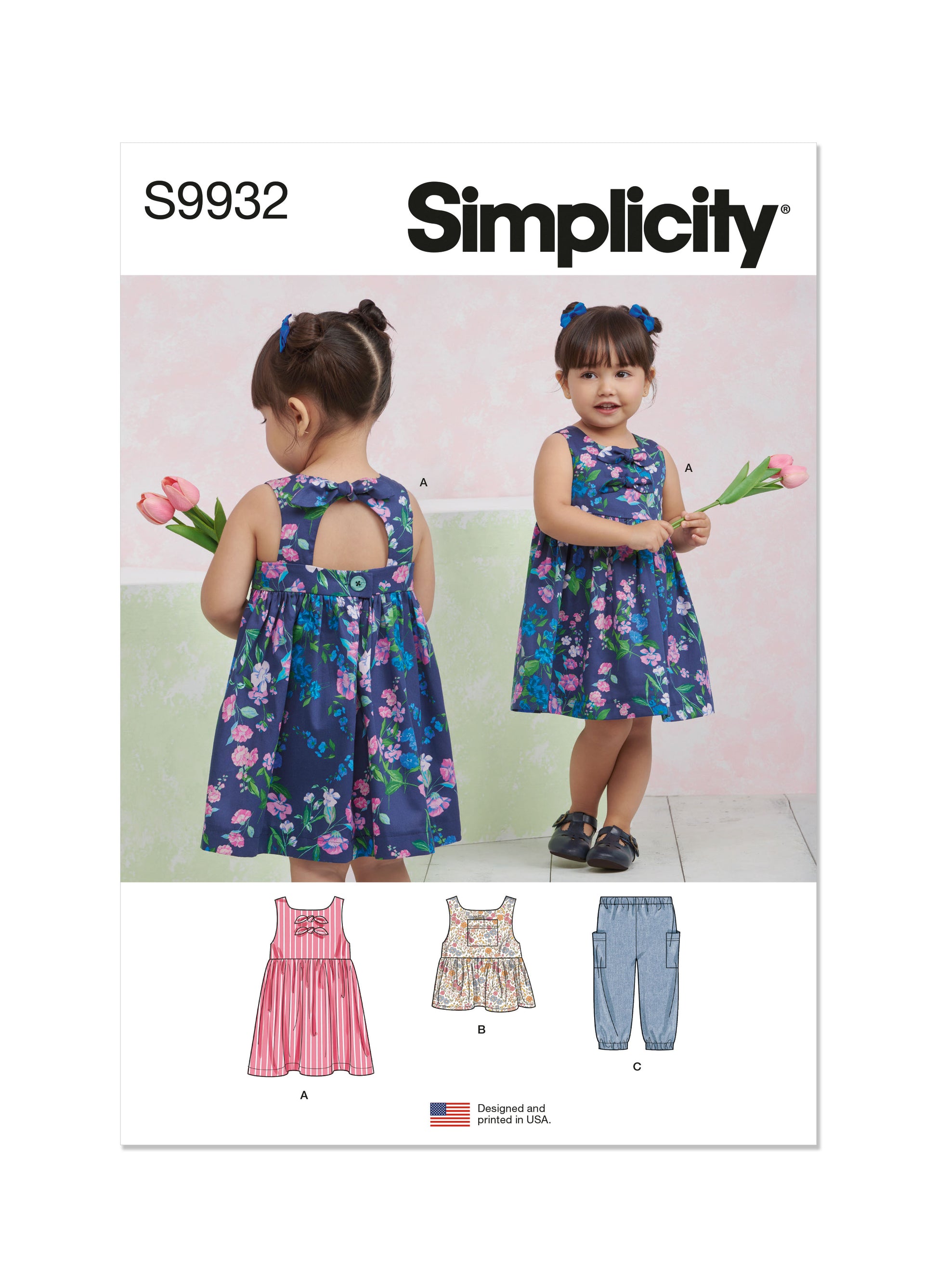Dress and top have gathers at waist, ties, button closure and an open back. Dress has front bows. Top has front pocket. Ankle length pants have side pockets and elastic at the legs and waistband.