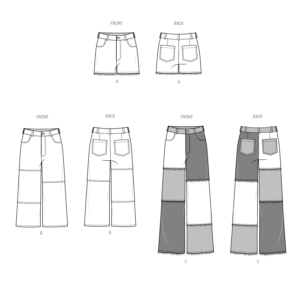 Shorts and pants have front fly zipper with button closure, side and back pockets, and waistband with belt loops. Views A and C have raw frayed edges. View C has two contrasts.