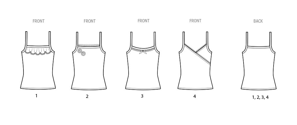 Vintage Simplicity 1980's Misses Pullover Tops....A Time-Saver Stretch Knit Pattern. One-yard tops: each takes 1 yard or less of 60'' fabric. Top Stitched Tops have self-banded straps and lace trims. V. 1 has self-ruffle flounce. V. 2 has optional lace applique. V. 3 has optional satin ribbon trim. V. 4 has mock wrap front. Authentic Vintage Reproduction.