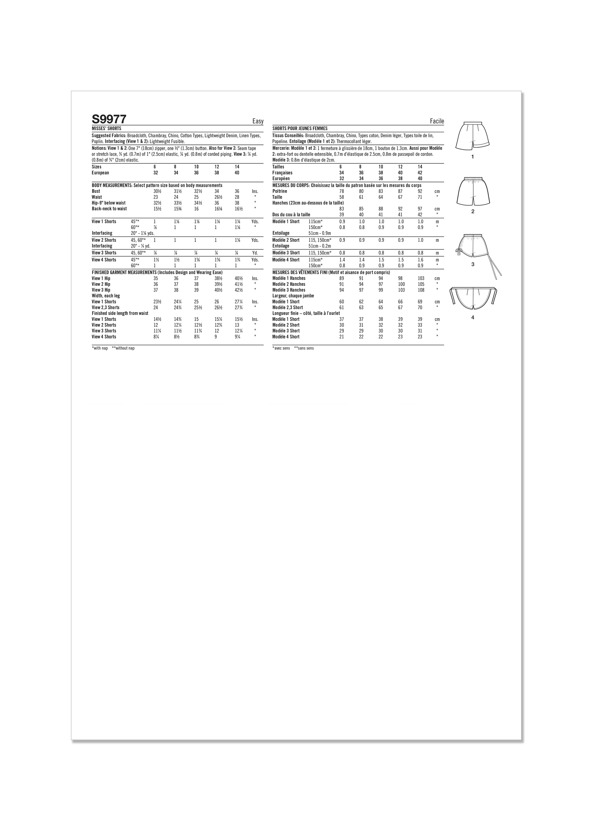 Vintage Simplicity 1980's misses' set of shorts pattern. One-yard shorts: each pair of shorts takes 1 yard or less of 45" or 60" fabric. Views 1 and 2 have front zipper. View 1 has waistband, yoke and pockets with front tucks. Wrong side of fabric shows when legs are rolled up. View 2 has front buttoned waistband, back elastic waistline casing and piping trim. View 3 shorts have elastic waistline casing and drawstring at sides. View 4 wrapped shorts have high cut legs, front waistband fastened in back and back waistband tied in front. Authentic Vintage Reproduction.