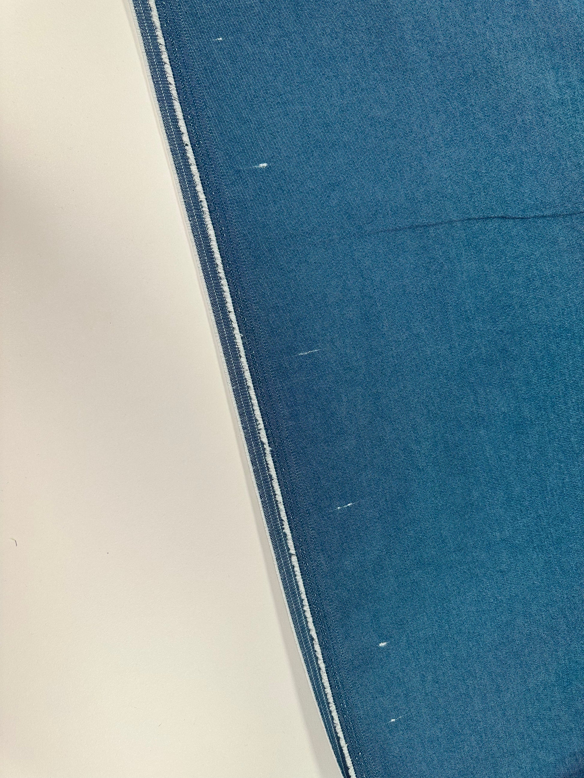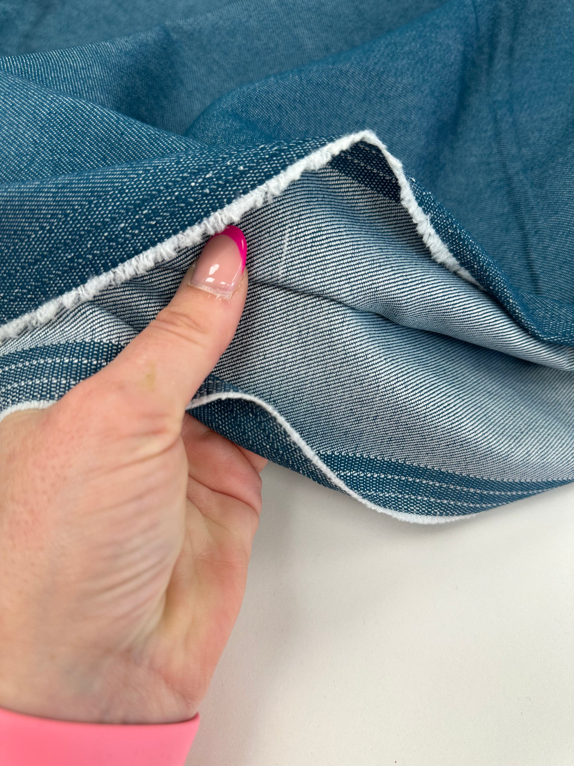 This denim is lighter than rigid jeans denims and has more flexibility, however it is not as light as chambray. It is similar in weight and feel to a cotton canvas.