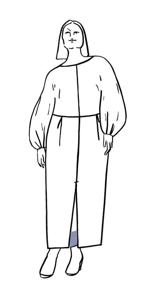 For the main fabric of the dress and skirt, choose a light to medium-weight woven fabric. Shirting fabrics, cottons, and poplins work well. Some stiffness and structure will help with the sleeves. You can also make the skirt from linen for a more organic and relaxed look. For the lining, choose a smooth, lightweight woven fabric such as satin. The blouse works best with soft woven fabrics like double gauze. It’s also great when made from knits. For the sleeve lining, you can use the same fabric as for the blouse itself or choose a lighter fabric if needed. For a more structured look, make the blouse from cotton poplin. The maxi dress sample is made from lightweight “Orvokki Blue Cotton” (100% cotton, roughly 2.06 oz/70 gsm) by Kauniste. The skirt is made from “Mercerized Ikat” (100% cot- ton, 2.65 oz/90 gsm) by Kind Cloth and the blouse is made from grey organic double gauze (100% cotton, 4.13 oz/140 gsm) by Siebenblau.