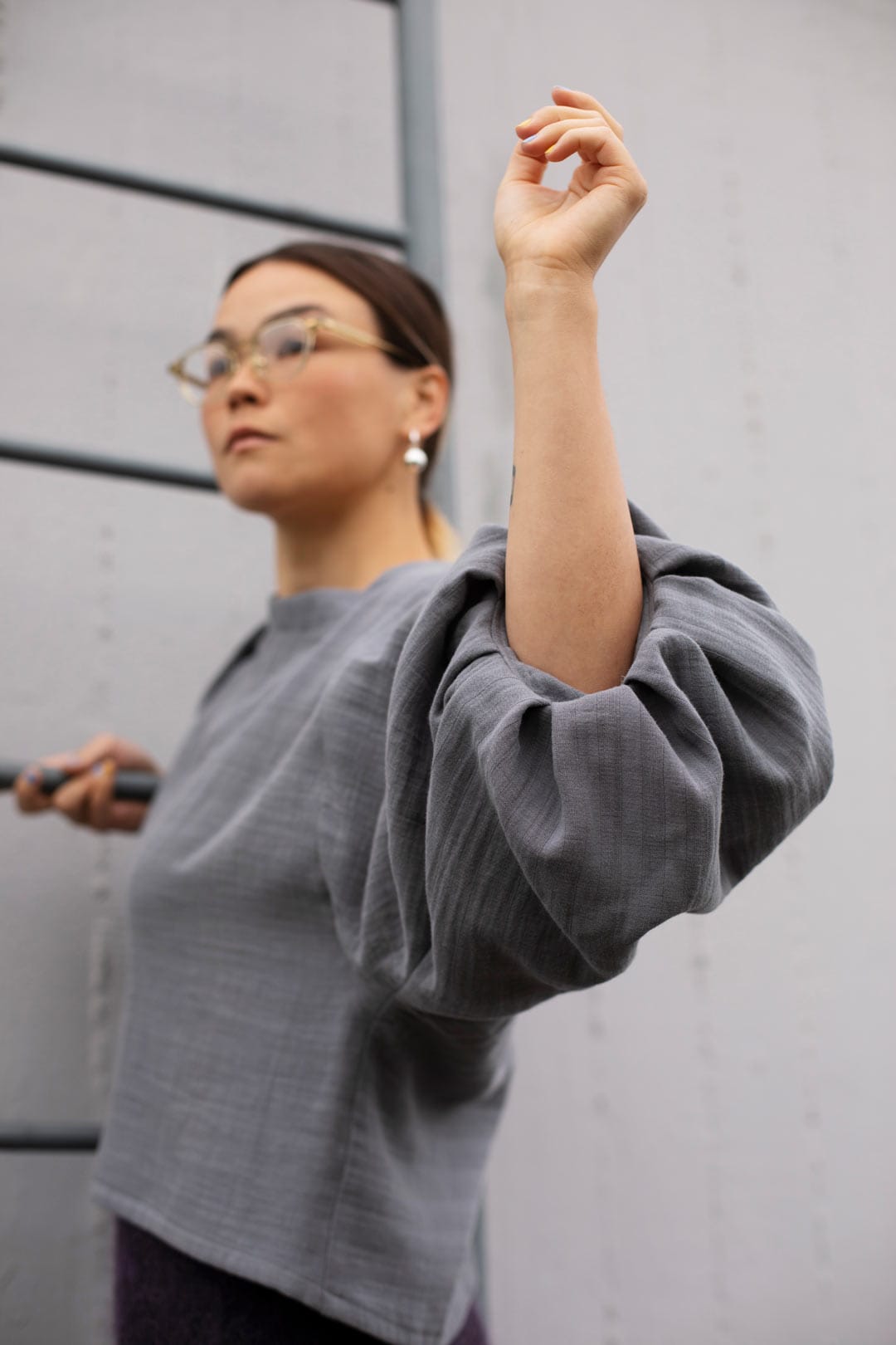 Mila Moisio is TAUKO’s editor-in-chief and one of the founders. The AURELIA dress was inspired by a beautiful photograph of Pina Bausch by Walter Vogel in 1966. She is wearing a fitted boat-neck dress with voluminous sleeves.