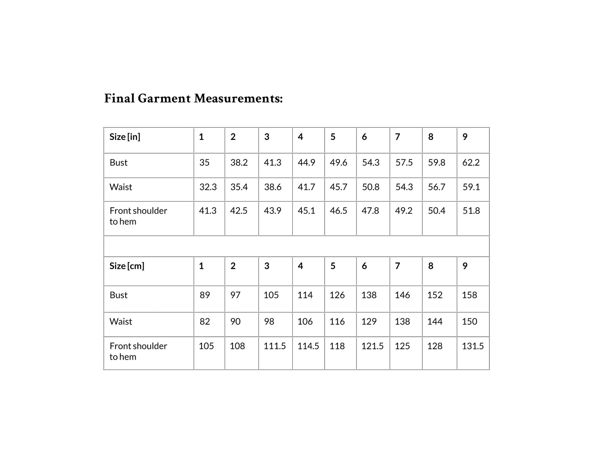 Choose your size based on your bust circumference. Add a recommended positive ease of 2.6–4.7"/7–12 cm. Pick the size that is the best match for your bust. Note: As this is a slip-on design, take care that your bust measurement doesn’t exceed the waist measurement of the finished dress.
